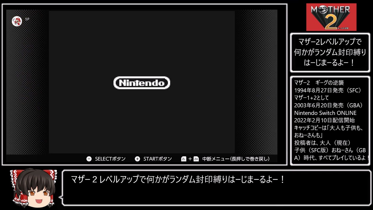 まさか本当にマザー2が配信開始されると思っていなかったので初投稿です。<br><br>追記 ジョルジュ早乙女様、広告ありがとうございます。<br><br>【ルール】<br><br>・レベルが奇数になる度に装備、アイテム、食べ物、PSIを1つ封印します<br>・封印対象はキーアイテム、封印されても支障のないアイテム(えはがき等)、<br>テレポート、あなぬけネズミ、キャッシュカードを除く全239個です<br>・ジェフが修理するとアイテムになるこわれたものと、修理後のアイテムは<br>1アイテムでカウントします(壊れたスプレーとディフェンススプレーは同一アイテムと考えます)<br>・封印されたらできるだけ速やかに捨てるか預けます。売却は不可としますが<br>使ったり装備しなければ持っているのはOKとします<br>・ブンブーンが使うサイコシールドΣ、プーがかえってきたゲップー撃破時に<br>・使用するスターストームα及びタライジャブのサルの多い穴で必要なアイテムは<br>封印されていても使用可とします<br>・逃走は可能です<br>・バトル終了時全員生存ルールは存在しません<br>・バグ、階段抜け、崖抜け、状況再現、うみたてたまご錬金は使用しません<br>・進行及び完走を最優先とするため封印されたアイテムを使ってしまったら追加で1封印して続行します<br><br>あくまで普通プレイのスパイスとしてランダム封印を用います<br>私のプレイスキルとキャパではこれが限界です<br>もっとキツい縛り希望兄貴姉貴は自分で走って、どうぞ<br>私もやったんだからさ(お約束)<br>
