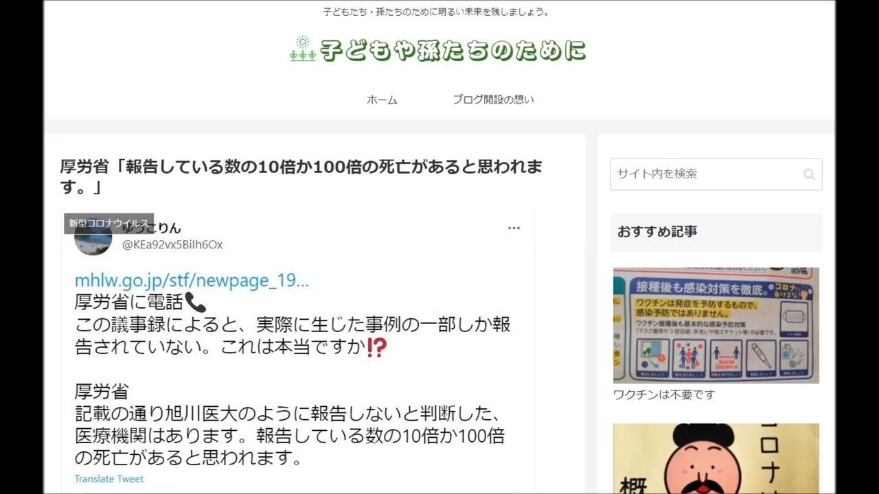 Dr. Geert Vanden Bossche<br>子どもへの接種は許されない罪 <a href="https://rumble.com/vsm2qp-48059233.html" target="_blank" rel="noopener nofollow">https://rumble.com/vsm2qp-48059233.html</a><br>子どもへの接種は絶対にしてはいけない。<a href="https://rumble.com/vsa86v-vaccinate-children-absolute-no-go.html" target="_blank" rel="noopener nofollow">https://rumble.com/vsa86v-vaccinate-children-absolute-no-go.html</a> <br>おすすめ <a href="https://www.nicovideo.jp/watch/sm38733330" target="_blank" rel="noopener nofollow">https://www.nicovideo.jp/watch/sm38733330</a><br><br>引用元<br>子どもや孫たちのために<br><a href="https://ichisaburo.com/4343/" target="_blank" rel="noopener nofollow">https://ichisaburo.com/4343/</a><br><br />日月神示に<br>『「死ぬことで助ける」と「生かすことで助ける」の状況はあるが‥』との表現があります<br>これから先(12年程度)の辛苦さを示しているとも思えます<br>『食糧難の混乱、無政府状態から同胞を食する人まで現れる』とも<br>今日明日の食事で死を覚悟しなければならない家族と、ある程度(食について)安泰な人が混在した時、一体何が起こるだろうか<br>"今だけ" の駄賃を貰ってDS側に付いている人は、自らの行いがより強烈な地獄に向かわせていることに気付いて欲しい<br><br>ロックフェラーやロスチャイルドでさえ、そんな地獄の様相の上に立てたとて、果たして幸福や安泰で居られるだろうか<br>日月には『空を飛ぶ人と地を這う人に分かれる』とあった<br>移動には航空機を使って(会合を)回避するのかも知れないが、一歩外を見回せば地獄‥<br>そんな世界を標榜する‥ 今の時点で既に狂気としか思えない<br>今ある豊かさや文化などたちまち崩壊するだろうし、航空機を製造維持するコミュニティーなど数万人で出来る訳がない<br>十億人を残すと目論んでいるのかも知れないが、殆どがゾンビのような体(脳を含めて)では墜落が頻発するものしか造れないだろう<br><br>一方、『死ぬことで助ける』という側面があるなら‥<br>何が正しく何がそうでないのか‥<br>確かに強弁(自らは正しいと思い込むこと)そのものがより悲惨をもたらすことも‥<br>それらの側面というのは、同一平面というより上下の関係になっていることの方が多そうだ<br>余りに上の立場からの側面など、英知吸収の途上からは認識しようがない<br><br><br>このIDはウクライナ関連動画(複数)でアカウント制限(投稿不可)になったため別アカを作りました<br><a href="https://www.nicovideo.jp/user/126388289" target="_blank" rel="noopener nofollow">https://www.nicovideo.jp/user/126388289</a>