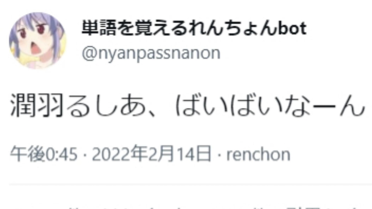 2022年2月14日の単語を覚えるれんちょんbotの呟きが話題になっていたので紹介します。「TLのツイートから名詞をランダムに選出し、セリフ風に呟きます。」とのことです。面白いですよね。<br>動画内での画像の動きが少ないのでYoutubeには投稿できません。今日は疲れているのでこの動画で終わりです。<br><br>過去動画<br>【朗報】歌い手まふまふ、ホロライブ潤羽るしあとの同棲疑惑を否定<br><a href="https://www.nicovideo.jp/watch/sm40027377" target="_blank" rel="noopener nofollow">https://www.nicovideo.jp/watch/sm40027377</a><br><br>引用<br><a href="https://twpf.jp/nyanpassnanon" target="_blank" rel="noopener nofollow">https://twpf.jp/nyanpassnanon</a><br><a href="https://twitter.com/nyanpassnanon/status/1493068734336020480" target="_blank" rel="noopener nofollow">https://twitter.com/nyanpassnanon/status/1493068734336020480</a><br><br>今後の 製作予定動画<br>2022年4月~「バーチャルブッダより大切なお知らせ」<br>元にじさんじ運営幹部いわなが社長、新しい箱を立ち上げる<br>ホロライブファン、今更自分のみじめさに気が付き全身が冷えてしまう<br>鳴神裁「にじさんじの野良猫俺のこと好きだよな?」<br>まことに動画を削除されたVTuberが引退を発表<br>にじさんじ×DLsite ASMRコラボ5~6弾販売中止<br>【悲報】鳴神裁「裁判をすっ飛ばして逮捕はあり得ない」<br>にじさんじ引退者まとめPart.3<br>にじさんじとストーカー被害まとめ<br>【悲報】にじさんじライバー、一本満足バーを一度に二本食べてしまう<br>夕刻ロベルのデスクトップアイコン非表示設定が配信者の鑑だという話<br><br>公開マイリスト<br>1 <a href="https://www.nicovideo.jp/mylist/66855587" target="_blank" rel="noopener nofollow">https://www.nicovideo.jp/mylist/66855587</a><br>2 <a href="https://www.nicovideo.jp/mylist/71980663" target="_blank" rel="noopener nofollow">https://www.nicovideo.jp/mylist/71980663</a><br>Youtube <a href="https://www.youtube.com/channel/UCzYQPx8MeE99DUkW9Y_txJw" target="_blank" rel="noopener nofollow">https://www.youtube.com/channel/UCzYQPx8MeE99DUkW9Y_txJw</a><br>twitter <a href="https://twitter.com/V_Virgin_Mary" target="_blank" rel="noopener nofollow">https://twitter.com/V_Virgin_Mary</a><br><br>使用素材<br>高品質なフリー動画素材 - Pixabay <a href="https://pixabay.com/ja/videos" target="_blank" rel="noopener nofollow">https://pixabay.com/ja/videos</a><br><a href="https://dova-s.jp/bgm/play14435.html" target="_blank" rel="noopener nofollow">https://dova-s.jp/bgm/play14435.html</a>