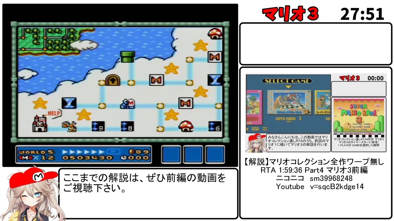 マリオコレクション全作ワープ無しRTAのうち、4作目のスーパーマリオブラザーズ3後編のゆっくり解説をします。<br><br>・Furopen様 サブピクセルマニピュレーション等解説 (<a href="https://furopen.hatenablog.com" target="_blank" rel="noopener nofollow">https://furopen.hatenablog.com</a> )<br>・mar573kan様 Wrong Warp 記録動画 (<a href="https://youtu.be/KpAi_9i7iLQ" target="_blank" rel="noopener nofollow">https://youtu.be/KpAi_9i7iLQ</a> )<br><br>Part1 マリオUSA(<a href="https://www.nicovideo.jp/watch/sm39823792" class="watch">sm39823792</a>)<br>Part2 マリオ2(<a href="https://www.nicovideo.jp/watch/sm39880347" class="watch">sm39880347</a>)<br>Part3 マリオ1(<a href="https://www.nicovideo.jp/watch/sm39907765" class="watch">sm39907765</a>)<br>Part3 マリオ3前編(<a href="https://www.nicovideo.jp/watch/sm39968248" class="watch">sm39968248</a>)<br>解説シリーズリスト(<a href="https://www.nicovideo.jp/mylist/72452758" target="_blank" rel="noopener">mylist/72452758</a>)<br><br>解説なし全作通し動画(<a href="https://www.nicovideo.jp/watch/sm39755033" class="watch">sm39755033</a>)<br>Youtube版→(<a href="https://youtu.be/KCDCH7zTYH0" target="_blank" rel="noopener nofollow">https://youtu.be/KCDCH7zTYH0</a> )<br><br>使用させて頂いたソフト・素材<br>・動画編集<br> ・ゆっくりMovieMaker4β(<a href="https://manjubox.net/ymm4/" target="_blank" rel="noopener nofollow">https://manjubox.net/ymm4/</a> )<br> ・AviUtl(<a href="http://spring-fragrance.mints.ne.jp/aviutl/" target="_blank" rel="noopener nofollow">http://spring-fragrance.mints.ne.jp/aviutl/</a> )<br>・音声素材<br> ・VOICEVOX_春日部つむぎ(<a href="https://voicevox.hiroshiba.jp/" target="_blank" rel="noopener nofollow">https://voicevox.hiroshiba.jp/</a> )<br> ・春日部つむぎ公式立ち絵素材(<a href="https://kasukabe294.booth.pm/items/3474402" target="_blank" rel="noopener nofollow">https://kasukabe294.booth.pm/items/3474402</a> )<br><br>