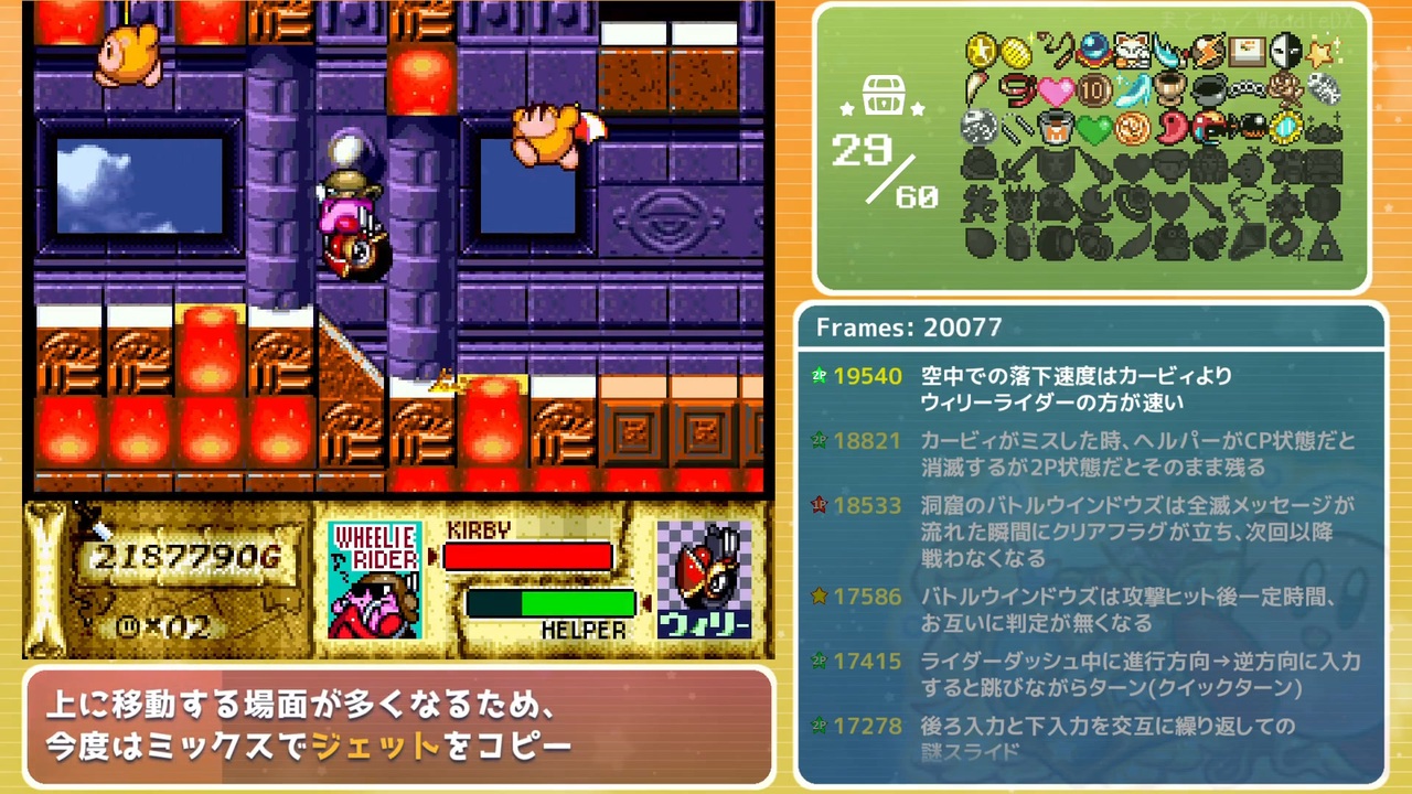 おたから全回収(+全ボス撃破)でクリアするTASです。<br>前記録(<a href="https://www.nicovideo.jp/watch/sm4307805" class="watch">sm4307805</a>)から1分14秒位更新。<br><br>〇Length(起動~脱出ワープスター搭乗):13:57.86(50455F)<br>※動画ではリフレッシュレートの誤差により50354F<br>〇Re-record count: 47852<br><br>●別枠で字幕解説を入れています<br> <span style="color: #ff0000;"><strong>※右下の詳細解説は2回目以降の視聴で読むことをオススメします</strong></span><br><br>★マイリスト:<a href="https://www.nicovideo.jp/mylist/2861086" target="_blank" rel="noopener">mylist/2861086</a><br>●前記録:<a href="https://www.nicovideo.jp/watch/sm4307805" class="watch">sm4307805</a>