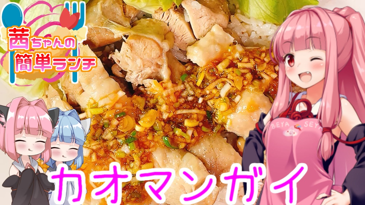 先週投稿した歌うボイスロイドキッチン(<a href="https://www.nicovideo.jp/watch/sm40019206" class="watch">sm40019206</a> )の本編になります!<br>you tubeのナレーションも変えてます!<br>よかったらこちらも合わせてお願いします!<br>【<a href="https://youtu.be/xWqWPYWE_zo" target="_blank" rel="noopener nofollow">https://youtu.be/xWqWPYWE_zo</a> 】<br><br><span style="color: #0000ff; font-size: 16px;"><strong>☆カオマンガイ(2人前)☆</strong></span><br><br>・お米 2合<br>・鶏もも肉 1枚<br>・鶏ガラスープの素 小さじ1<br>・おろしにんにく 小さじ1/2<br>・おろししょうが 小さじ1<br>・塩コショウ 少々<br>・長ネギ(青い部分) 1本分<br><br>【タレ】<br>・長ネギ(みじん切り) 1本分<br>・おろししょうが 小さじ1/2<br>・醤油 小さじ2<br>・オイスターソース 小さじ2<br>・砂糖 小さじ1<br>・レモン汁 小さじ1<br>・水 大さじ1<br>・ごま油 小さじ1/2<br>・ナンプラー(お好みで)小さじ1<br><br>【レシピ】<br>1.お米を研いだら2合の線より少し少なめに水を入れる。<br>2.鶏肉はフォークで何箇所か穴を開ける。<br>3.調味料、長ネギ、鶏肉の皮を下にして入れたらスイッチオン!<br>4.タレは全部の材料を混ぜるだけ!<br>5.炊きあがったら火傷に注意しながら、鶏肉を食べやすい大きさに切って<br>お皿に盛り付けタレをかけたら完成!<br><br>【☆お借りした素敵な素材☆(順不同)<br><br>【立ち絵】<br>ハーパー 様<br>山風P 様<br>ペテン師 様<br><br>【素材】<br>ニコニ・コモンズ 様<br>フリー素材「写真AC」「イラストAC」 様<br>フリーBGM:DOVA-SYNDROME 様<br><br>最後にこの動画を見てくださった皆様に心からの感謝と、<br>これからも良きご縁がありますように!(*´ω`*)<br><br>前作品:ささらのパスタ【<a href="https://www.nicovideo.jp/watch/sm40014974" class="watch">sm40014974</a> 】<br>次回作:レシピ合同誌【<a href="https://www.nicovideo.jp/watch/sm40075265" class="watch">sm40075265</a> 】<br><br>Twitter:<a href="https://twitter.com/moegimon" target="_blank" rel="noopener nofollow">https://twitter.com/moegimon</a> <br>you tube:<a href="https://www.youtube.com/channel/UCP2N3uBfzKEoqCGviIvs0Ew" target="_blank" rel="noopener nofollow">https://www.youtube.com/channel/UCP2N3uBfzKEoqCGviIvs0Ew</a> <br>ご支援:<a href="https://www.amazon.co.jp/hz/wishlist/ls/ZBWL10H8ML75?ref_=wl_share" target="_blank" rel="noopener nofollow">https://www.amazon.co.jp/hz/wishlist/ls/ZBWL10H8ML75?ref_=wl_share</a>