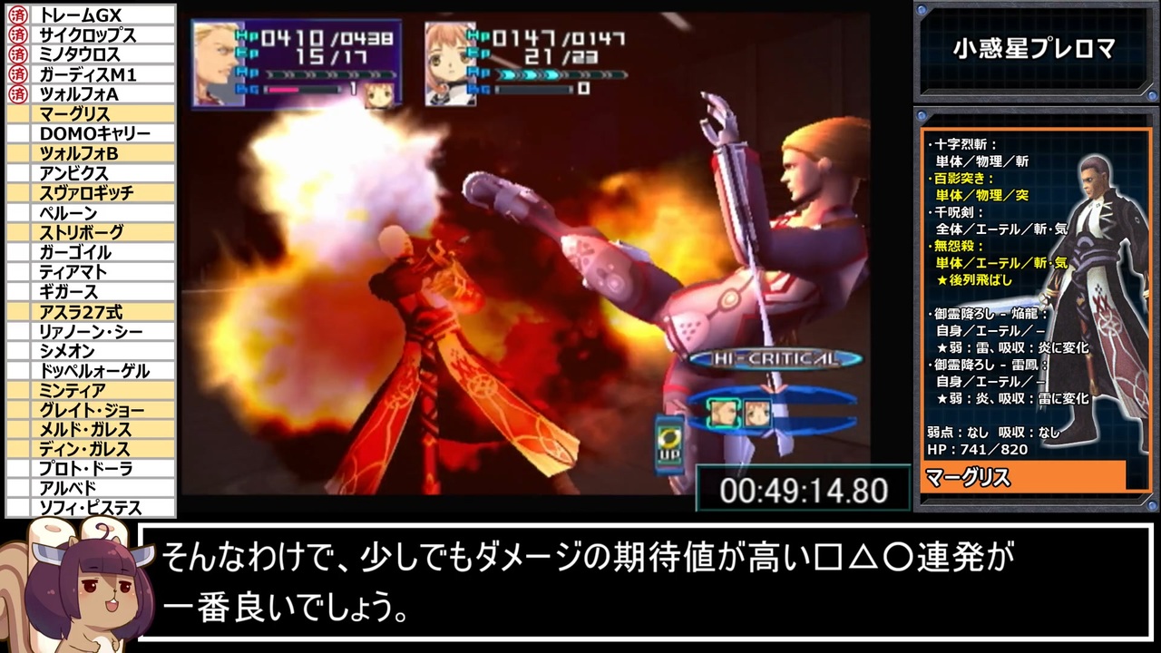 ジギー×モモすき<br>Jr.×モモふつう<br>アルベド×モモきらい<br>モモ×キルシュヴァッサーはもっとやれ<br><br>~追記~<br>Q.ウインドミキサーは?<br>A.ウインドミキサーはレンジが近接なので使ってなかったですが、<br>属性がエーテルなので△□○にセットして使ったほうがダメージ出そうですね(ガバ調査)<br>ただモモはあまり攻撃しない&演出が長いので、タイム的には遅くなるかと<br><br>プレロマ侵入~脱出まで<br><br><a href="https://www.nicovideo.jp/watch/sm40012536" class="watch">sm40012536</a>←前|<a href="https://www.nicovideo.jp/mylist/72710842" target="_blank" rel="noopener">mylist/72710842</a>|次→<a href="https://www.nicovideo.jp/watch/sm40094221" class="watch">sm40094221</a><br>本パートのムービーシーンはこちら→<a href="https://www.nicovideo.jp/watch/sm40046242" class="watch">sm40046242</a>/<a href="https://www.nicovideo.jp/watch/sm40051354" class="watch">sm40051354</a><br><br>RTA part1集 <a href="https://www.nicovideo.jp/mylist/71936684" target="_blank" rel="noopener">mylist/71936684</a><br><br><strong><u>▼お借りした素材達</u></strong><br>・【blueberry様】:東北リスたん素材 - <a href="https://seiga.nicovideo.jp/seiga/im6398652" target="_blank" rel="noopener">im6398652</a><br>・【インギンブレイ様】:解説枠(SF) - <a href="https://commons.nicovideo.jp/works/nc25831" target="_blank" rel="noopener">nc25831</a><br>・【hiropon様】:指さし棒 - <a href="https://commons.nicovideo.jp/works/nc190353" target="_blank" rel="noopener">nc190353</a><br>・【公式様】:東北ずん子のイラスト/3Dデータ - <a href="https://zunko.jp/con_illust.html" target="_blank" rel="noopener nofollow">https://zunko.jp/con_illust.html</a><br><br><strong><u>▼プレイ環境</u></strong><br>・本体(実機):SCPH-70000<br>・コントローラ:SCPH-10010<br>・ディスク:普通のやつ<br><br><strong><u>▼レギュレーション/縛り等</u></strong><br>・計測開始:PS2起動時<br>・計測終了:ラスボス(ソフィ・ピステス)の撃破ムービーが開始した瞬間<br>・バグ禁止<br>・任意戦闘を含む、全ての中ボス・隠しボスを倒してクリアする