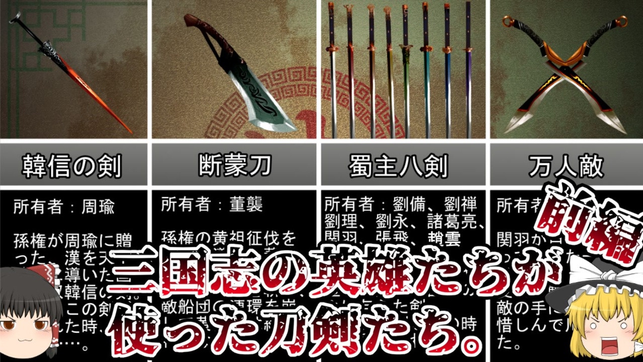 この動画は東方projectの二次創作です。AquesTalkライセンス購入済み。<br> <br>◇反三国志二次創作同人誌「叔漢二國史」<a href="https://danxiawangchao.booth.pm/items/2029329" target="_blank" rel="noopener nofollow">https://danxiawangchao.booth.pm/items/2029329</a><br><br>後編<a href="https://www.nicovideo.jp/watch/sm40130187" class="watch">sm40130187</a><br><br>いつもは三国志のマイナーな人物やもっと評価されるべき人物を紹介しているこのシリーズですが、<br>今回は番外編として、三国志の英雄たちが使ったと語られる刀剣の逸話をご紹介いたします。<br>南朝は梁の時代、古今刀剣録という様々な時代の刀剣をまとめた書物が編纂されました。<br>その中には三国時代の名刀名剣も多く記録されており、三国志本文には見られない英雄たちの姿も垣間見れました。<br>前編では呉と蜀の人物の刀剣を紹介いたします。<br><br>▷第四十七回「孫寒華」<a href="https://www.nicovideo.jp/watch/sm39922829" class="watch">sm39922829</a><br>▷第四十八回「郭脩」<a href="https://www.nicovideo.jp/watch/sm40254046" class="watch">sm40254046</a><br><br>◆◆◆◆◆◆◆◆◆◆◆◆◆◆◆◆◆◆◆◆◆◆◆<br>参考文献、補足など<br>亶夏王朝府 <a href="https://danxiawangchao.hatenablog.com/" target="_blank" rel="noopener nofollow">https://danxiawangchao.hatenablog.com/</a><br>この動画の参考文献 <a href="https://danxiawangchao.hatenablog.com/entry/2022/03/06/025733" target="_blank" rel="noopener nofollow">https://danxiawangchao.hatenablog.com/entry/2022/03/06/025733</a><br><br>この動画のイラストまとめ<br>Pixiv <a href="https://www.pixiv.net/artworks/96708840" target="_blank" rel="noopener nofollow">https://www.pixiv.net/artworks/96708840</a><br> <a href="https://www.pixiv.net/artworks/96709018" target="_blank" rel="noopener nofollow">https://www.pixiv.net/artworks/96709018</a><br>ニコニコ静画 <a href="https://seiga.nicovideo.jp/seiga/im10912807" target="_blank" rel="noopener">im10912807</a> <a href="https://seiga.nicovideo.jp/seiga/im10912809" target="_blank" rel="noopener">im10912809</a> <a href="https://seiga.nicovideo.jp/seiga/im10912810" target="_blank" rel="noopener">im10912810</a><br>BOOTH <a href="https://danxiawangchao.booth.pm/items/3702728" target="_blank" rel="noopener nofollow">https://danxiawangchao.booth.pm/items/3702728</a><br><br>YouTubeにもアップロードしています。よろしければ評価、チャンネル登録よろしくお願いします。<br><a href="https://youtu.be/ovDzT5x9Ux4" target="_blank" rel="noopener nofollow">https://youtu.be/ovDzT5x9Ux4</a><br>◆◆◆◆◆◆◆◆◆◆◆◆◆◆◆◆◆◆◆◆◆◆◆<br><br>音楽効果音提供<br>チンドン演歌/稿屋 隆 様<br>ミスト/甘茶の音楽工房 様<br>鋼炎/REV 様<br>Silver/ISAo 様<br>Aggression/shimtone 様<br>効果音提供/効果音ラボ 様<br>