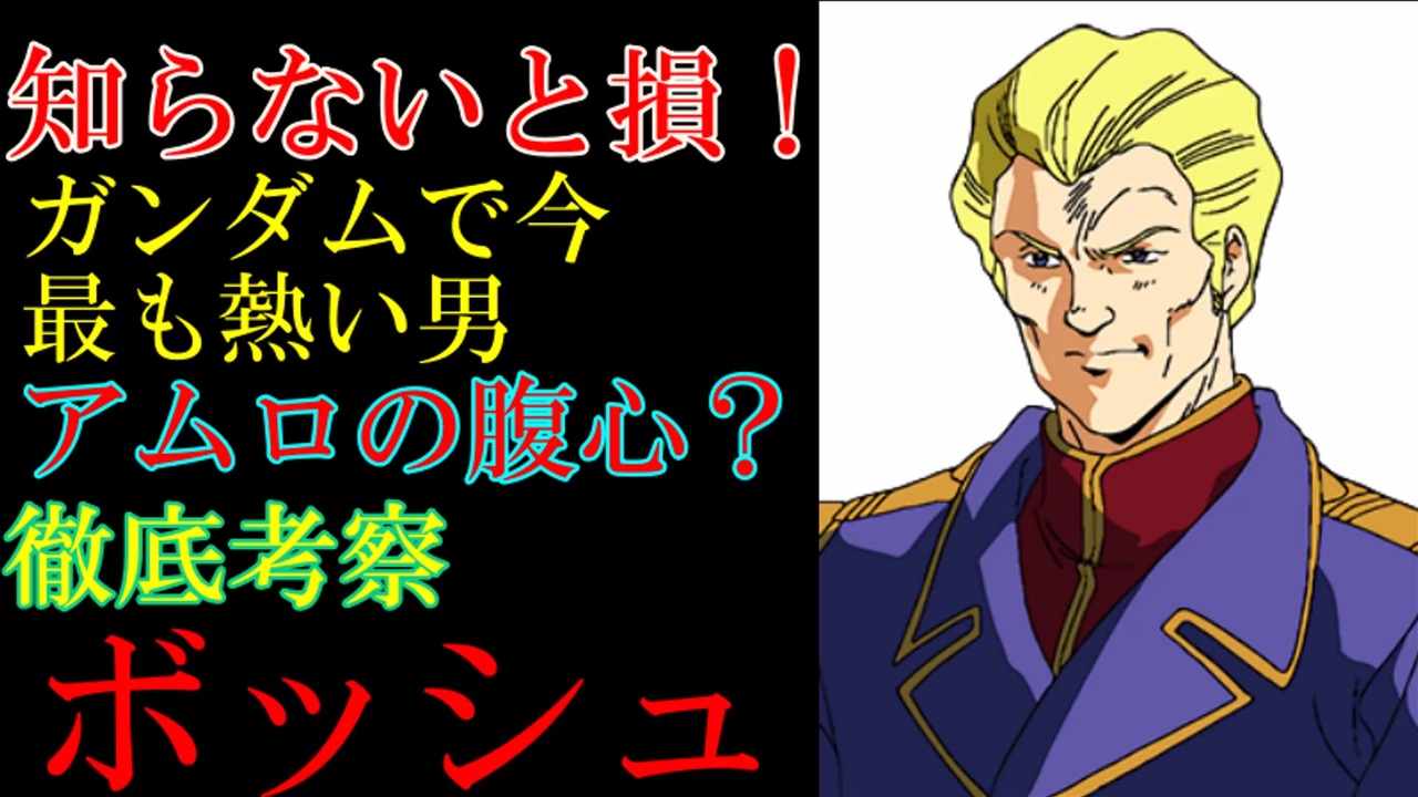 機動戦士ガンダムF90に登場するキャラクター、ボッシュ・ウェラー大尉のゆっくり解説動画です。<br><br>設定がどんどん変わっていくただのおもしろ闇のガンダムおじさんだった頃のボッシュと、評価が一気に変わった愛が重いアムロ大好きおじさんになったボッシュを解説、考察していきます。<br><br>今回はほぼ全部考察です。<br><br>ボッシュおじさんは、アムロから受け継いだバトンをボロボロになりながらもちゃんとデフに渡せたんでしょうか