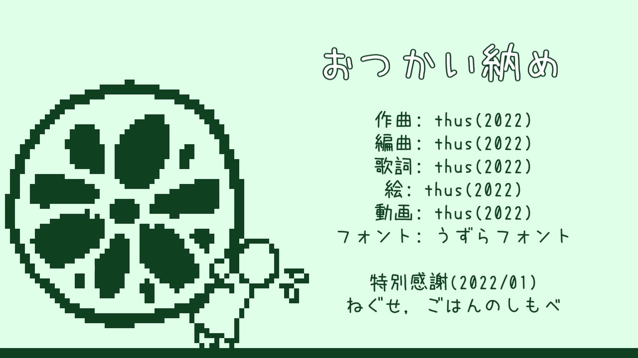 どうも、れんこんを大量に買うthusです。今回は小品です。セリフさん主催の「れんこん投稿祭2022」出展作品。(詳細:<a href="https://twitter.com/serifu_krag/status/1485929834455138308" target="_blank" rel="noopener nofollow">https://twitter.com/serifu_krag/status/1485929834455138308</a> )<br> れんこんなんて最後に食べたのは数年前の正月だった…気がします。正月の御節料理には伝統的にそれぞれ願掛けの思いが入っているという話を耳にしたことがある方もいらっしゃると思われます。我が釁られた血族でも、元旦は必ず御節料理を食べていました。それで「この料理はどういう意味だったっけ」と、毎年毎年必ず訊いて、その席で一番の年配者が丁寧に説明をするという、我が釁られた血族の暗黙なる風習みたいなものがあるのです。そういう「あんたいっつもそれ言うなぁ、はっはっは…」という団欒の象徴みたいなのがあるじゃないですか。れんこん投稿祭と聞いて、そういう意識の糸手繰りをしたわけです。<br> ところで話は一転、小耳に挟んだ御話ですが、当祭主催のセリフさんはエンドレスニューイヤーに嵌って抜け出せなくなっているとかなっていないとか。種々の巷説が絶えませんが、酩酊堂ちゃんねるの御出演を契機にさあ愈々脱出できるのかなと思っていましたが、未だ嵌り続けているとか続けていないとか、矢張り巷説は絶えず浮遊し漂っています。涼宮ハルヒの憂鬱ならぬ、蓮根セリフの正月とでも申し上げましょうか。もし噂が本当であるのならば、誰かセリフさんをお助け下さい。私はどうも次元周波数が合わないようで、残念ながら無理でした。仕方がないので、兆超特価の巨大れんこんを沢山買って帰ることにします。ではまた次回。<br><br>2022/02/20:1千→2,525再生有難し→5千再生<br>//21:6千→1万再生有難乎<br>//23:2万再生<br>//25:3万再生<br>/05/03:4万再生<br /><br><br><br>====================<br>| 2026/01/04 21:00「インスペクタの自死未遂」:<a href="https://www.nicovideo.jp/watch/sm45800854" class="watch">sm45800854</a><br>| 投稿曲マイリスト:<a href="https://www.nicovideo.jp/mylist/57867175" target="_blank" rel="noopener">mylist/57867175</a><br>|――――――――――――――――――<br>| pixivFANBOX:<a href="https://thus.fanbox.cc/" target="_blank" rel="noopener nofollow">https://thus.fanbox.cc/</a><br>| アルバム等配信中:<a href="https://thus-library.blogspot.com/search/label/discography" target="_blank" rel="noopener nofollow">https://thus-library.blogspot.com/search/label/discography</a><br>| つなぐ(依頼・リクエスト):<a href="https://tsunagu.cloud/users/thus" target="_blank" rel="noopener nofollow">https://tsunagu.cloud/users/thus</a><br>|――――――――――――――――――<br>| YouTube:<a href="https://youtube.com/@thus" target="_blank" rel="noopener nofollow">https://youtube.com/@thus</a><br>| X:<a href="https://x.com/thus_submission" target="_blank" rel="noopener nofollow">https://x.com/thus_submission</a><br>| 他全リンク:<a href="https://lit.link/thus" target="_blank" rel="noopener nofollow">https://lit.link/thus</a><br>|――――――――――――――――――<br>| オフボーカル等:<a href="https://piapro.jp/thus_999discommunication" target="_blank" rel="noopener nofollow">https://piapro.jp/thus_999discommunication</a><br>| 楽曲/動画の二次利用に関して:<a href="https://bit.ly/3JRQQiZ" target="_blank" rel="noopener nofollow">https://bit.ly/3JRQQiZ</a><br><span style="color: #262626;">| </span><span style="color: #262626;"><strong>歌詞図書館(ふりがな有るよ!):</strong></span><a href="https://thus-library.blogspot.com/" target="_blank" rel="noopener nofollow">https://thus-library.blogspot.com/</a><br>====================