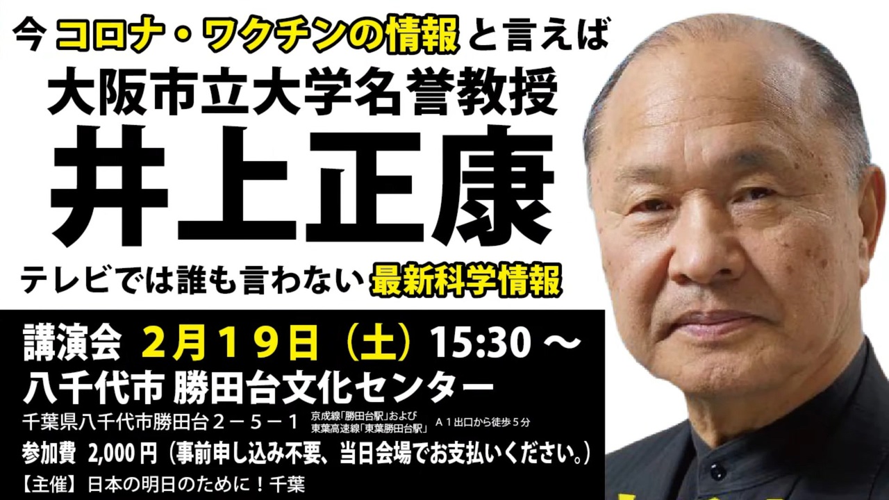 日時:2022年2月19日(土)15:30~ <br>場所:千葉県八千代市勝田台文化センター <br>主催:日本の明日のために!千葉 <br><br>「テレビでは誰も言わない最新科学情報」 <br>大阪市立大学名誉教授 井上正康先生講演会 <br><br>質疑応答(後半)の動画はこちら↓↓↓ <br><a href="https://www.nicovideo.jp/watch/sm40070586" target="_blank" rel="noopener nofollow">https://www.nicovideo.jp/watch/sm40070586</a><br><br>主催の藤江さんのアカウントでも全編公開されました(2022年2月27日)<br><a href="https://www.nicovideo.jp/watch/sm40102320" target="_blank" rel="noopener nofollow">https://www.nicovideo.jp/watch/sm40102320</a><br><br><br>【無料講演会開催のご案内】<br>日時:2月23日(水)13時30分~15時30分 <br>講師:井上正康先生 <br>場所:千葉県勝浦市 勝浦ホテル三日月 <br> <br>YouTubeライブ配信予定のチャンネルはこちら <br><a href="https://www.youtube.com/channel/UCWd-oBCyCUf7f8BMxMaKXGw" target="_blank" rel="noopener nofollow">https://www.youtube.com/channel/UCWd-oBCyCUf7f8BMxMaKXGw</a><br><br>ニコニコ生放送はこちら <br>【井上正康名誉教授】新型コロナウイルス勉強会【勝浦とコロナを考える会】 <br><a href="https://live.nicovideo.jp/watch/lv335839777" target="_blank" rel="noopener nofollow">https://live.nicovideo.jp/watch/lv335839777</a><br><br><br>【YouTubeチャンネル】<br>千葉で講演会やります!それも2回!【ラジオ】#256 <br><a href="https://www.youtube.com/watch?v=ERZz5kw7rHY" target="_blank" rel="noopener nofollow">https://www.youtube.com/watch?v=ERZz5kw7rHY</a><br><br>日本の人口増加を目指す男、藤江です! <br><a href="https://www.youtube.com/channel/UCLbros9OMv14-1s2-5Yf1jQ" target="_blank" rel="noopener nofollow">https://www.youtube.com/channel/UCLbros9OMv14-1s2-5Yf1jQ</a><br><br>日本の明日のために!千葉 <br><a href="https://www.youtube.com/channel/UCrLFrKpNahefzmdjYAw0nQw" target="_blank" rel="noopener nofollow">https://www.youtube.com/channel/UCrLFrKpNahefzmdjYAw0nQw</a><br><br>勝浦とコロナを考える会 <br><a href="https://www.youtube.com/channel/UCWd-oBCyCUf7f8BMxMaKXGw" target="_blank" rel="noopener nofollow">https://www.youtube.com/channel/UCWd-oBCyCUf7f8BMxMaKXGw</a><br><br>井上正康 健康科学研究所 現代適塾 公式ホームページ <br><a href="https://www.inouemasayasu.net/" target="_blank" rel="noopener nofollow">https://www.inouemasayasu.net/</a>