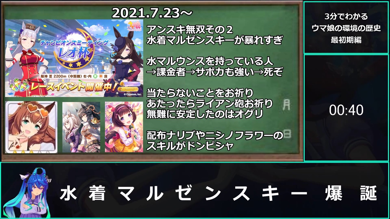 もう1年かー<br><br>対人戦基礎知識<br>初級編→<a href="https://www.nicovideo.jp/watch/sm39432258" class="watch">sm39432258</a><br>中級編→<a href="https://www.nicovideo.jp/watch/sm39432514" class="watch">sm39432514</a><br>スキル編→<a href="https://www.nicovideo.jp/watch/sm39433182" class="watch">sm39433182</a><br>スキルランキング編→<a href="https://www.nicovideo.jp/watch/sm39407156" class="watch">sm39407156</a><br>加速について→<a href="https://www.nicovideo.jp/watch/sm39583007" class="watch">sm39583007</a><br>コース別加速スキルランキング→<a href="https://www.nicovideo.jp/watch/sm39774678" class="watch">sm39774678</a><br><br>ツイッターも始めたのでよろしくなす<br><a href="https://twitter.com/umamusumetama" target="_blank" rel="noopener nofollow">https://twitter.com/umamusumetama</a><br><br>↓にあるシリーズから過去動画みれるぞ。<br>もうマイリスの時代じゃないんだ。悔しいけど仕方ないんだ。<br>