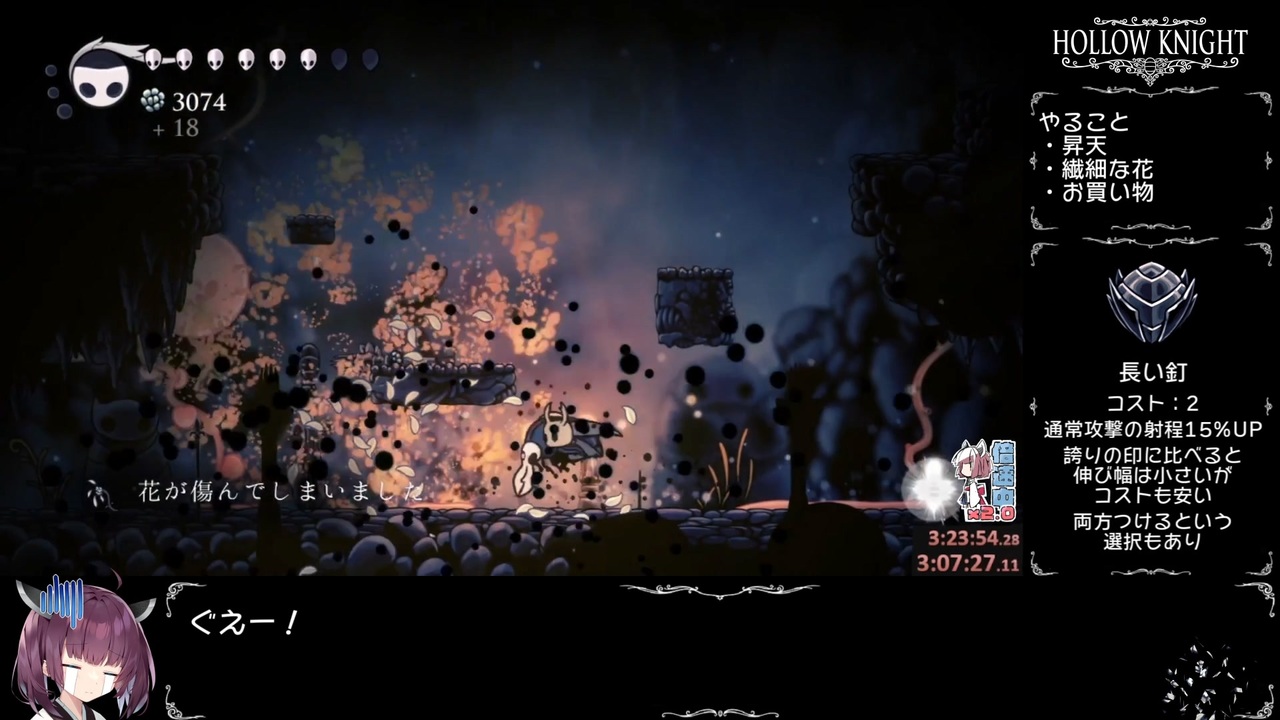 繊細なお花を運ぶパート<br><br>Hollow Knightのスピードランカテゴリー、112%+APB NMGに挑戦したものを東北きりたんが解説した動画です。<br>スピードラン初心者による拙いプレイですが生暖かい目でご視聴ください。<br><br>Hollow Knight steamページ<br><a href="https://store.steampowered.com/app/367520/Hollow_Knight/?l=japanese" target="_blank" rel="noopener nofollow">https://store.steampowered.com/app/367520/Hollow_Knight/?l=japanese</a><br><br>---------------------参考にさせていただいた動画など--------------------------<br>Darts-Nya兄貴<br><a href="https://www.nicovideo.jp/watch/sm36956592" class="watch">sm36956592</a><br>xion兄貴<br><a href="https://www.nicovideo.jp/watch/sm37844016" class="watch">sm37844016</a><br>キトさん兄貴<br><a href="https://www.nicovideo.jp/watch/sm36451261" class="watch">sm36451261</a><br>unyo兄貴<br><a href="https://youtu.be/Pr2LaAfNspU" target="_blank" rel="noopener nofollow">https://youtu.be/Pr2LaAfNspU</a><br>discordサーバー<br><a href="https://twitter.com/un_yo_san/status/1456597988944408577" target="_blank" rel="noopener nofollow">https://twitter.com/un_yo_san/status/1456597988944408577</a><br>英語版wiki<br><a href="https://hollowknight.fandom.com/wiki/Hollow_Knight_Wiki" target="_blank" rel="noopener nofollow">https://hollowknight.fandom.com/wiki/Hollow_Knight_Wiki</a><br>日本語版wiki<br><a href="https://wikiwiki.jp/hollowknight/" target="_blank" rel="noopener nofollow">https://wikiwiki.jp/hollowknight/</a><br>fu様のイラスト<br><a href="https://seiga.nicovideo.jp/seiga/im10911192" target="_blank" rel="noopener">im10911192</a><br>----------------------------------------------------------------------------------<br>無編集版<br><a href="https://youtu.be/znU_Q-g-gbE" target="_blank" rel="noopener nofollow">https://youtu.be/znU_Q-g-gbE</a><br><br>Part1:<a href="https://www.nicovideo.jp/watch/sm39866559" class="watch">sm39866559</a><br>前:<a href="https://www.nicovideo.jp/watch/sm40037650" class="watch">sm40037650</a><br>次:<a href="https://www.nicovideo.jp/watch/sm40127003" class="watch">sm40127003</a><br>