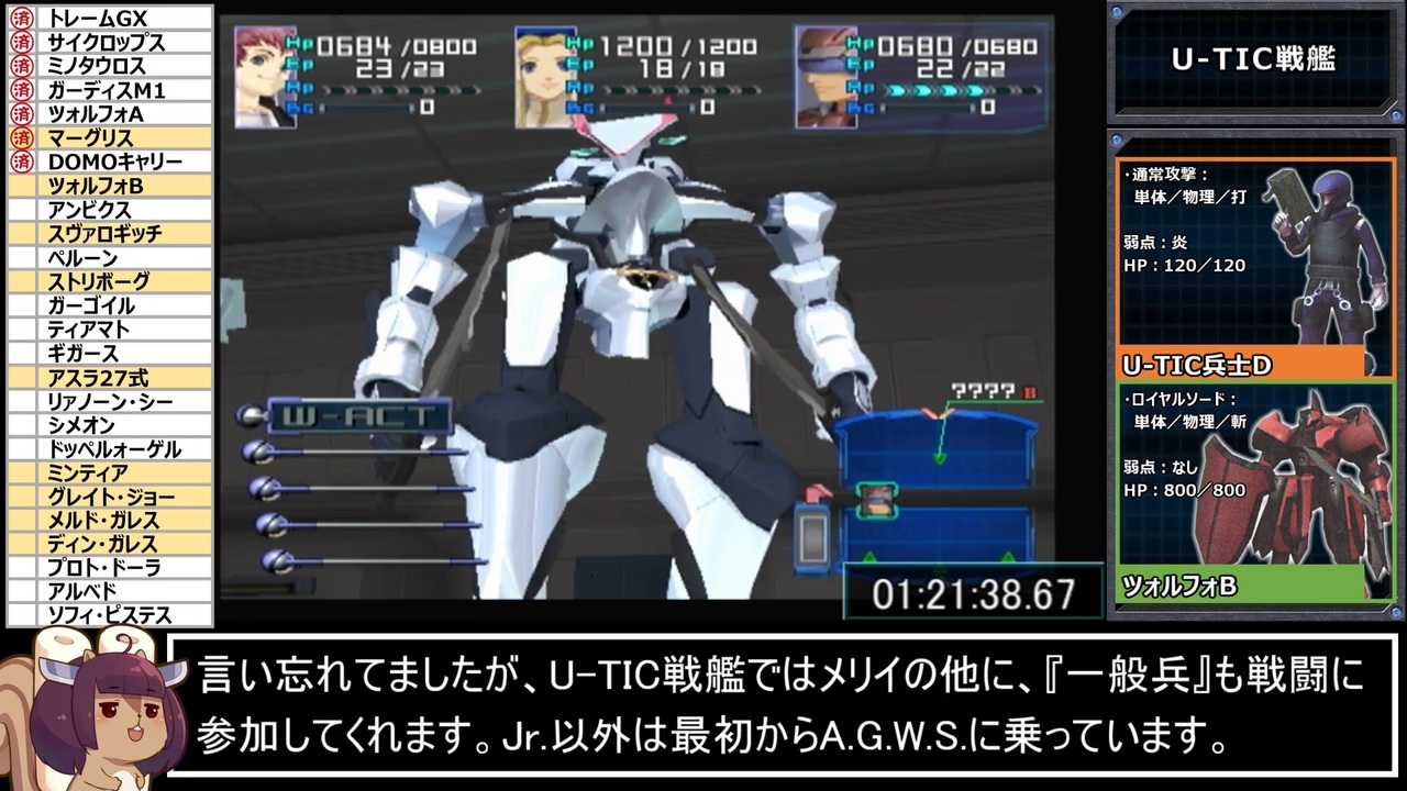 短めなので早めに投稿します<br>A.G.W.S.同士の戦いがあ^~たまらねぇぜ<br><br><span style="color: #ff0000;"><strong>~追記~<br><a href="#" class="seekTime" data-seekTime="7:33" onclick="seekNicoPlayer('#7:33'); return false;">#7:33</a> 文脈が分かりづらくて申し訳ないですが、<br>設定資料上、ウサ耳みたいなのがジェネレーターと記載があるのは<br>VX-20000のほうです。(ゼブルンは)知らなーい</strong></span><br><br>U-TIC戦艦編開始~アンビクス撃破まで<br><br><a href="https://www.nicovideo.jp/watch/sm40094221" class="watch">sm40094221</a>←前|<a href="https://www.nicovideo.jp/mylist/72710842" target="_blank" rel="noopener">mylist/72710842</a>|次→<a href="https://www.nicovideo.jp/watch/sm40115884" class="watch">sm40115884</a><br><br>本パートのムービーシーンはこちら→<a href="https://www.nicovideo.jp/watch/sm40101181" class="watch">sm40101181</a><br><br>RTA part1集 <a href="https://www.nicovideo.jp/mylist/71936684" target="_blank" rel="noopener">mylist/71936684</a><br><br><strong><u>▼お借りした素材達</u></strong><br>・【blueberry様】:東北リスたん素材 - <a href="https://seiga.nicovideo.jp/seiga/im6398652" target="_blank" rel="noopener">im6398652</a><br>・【インギンブレイ様】:解説枠(SF) - <a href="https://commons.nicovideo.jp/works/nc25831" target="_blank" rel="noopener">nc25831</a><br><br><strong><u>▼プレイ環境</u></strong><br>・本体(実機):SCPH-70000<br>・コントローラ:SCPH-10010<br>・ディスク:普通のやつ<br><br><strong><u>▼レギュレーション/縛り等</u></strong><br>・計測開始:PS2起動時<br>・計測終了:ラスボス(ソフィ・ピステス)の撃破ムービーが開始した瞬間<br>・バグ禁止<br>・任意戦闘を含む、全ての中ボス・隠しボスを倒してクリアする