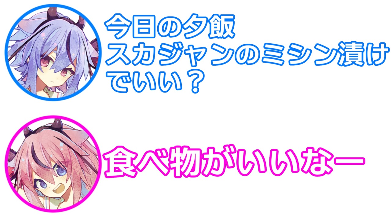 データ詳細 ミコト「今日の夕飯スカジャンでいい?」ヒメ「食べ物がいいな」【ふたセリフ 4】