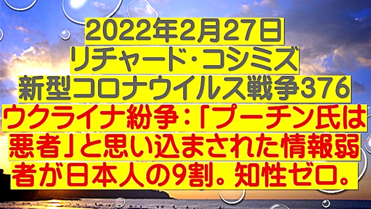<span style="color: #cc4125;"><strong>【 テーマ:新型コロナウイルス戦争 376 】</strong></span><br><br><span style="color: #ff0000;"><strong>「 ウクライナ紛争:『 ウラジーミル・プーチン氏は悪者 』と思い込まされた情報弱者が日本人の9割。<br> 知性ゼロ 」</strong></span><br><br> ◆DEEP STATE大富豪たちは、ウクライナに外国の極右勢力を送り込み、国家を乗っ取った。<br> そして、東部のロシア系住民を虐殺し、NATOに加盟させ、ロシアを刺激し、戦争に誘導し<br> ようとしている。<br><br> ◆DEEP STATE大富豪たちが使う手先は、いつの時代もクズの中のクズ。<br> 麻薬まみれ、汚い金まみれの暴徒。<br> 日本も同じ。ただし、騙された情報弱者のおじいちゃんたちも参加。<br><br> ◆DEEP STATE勢力は、旧ハザール王国再興のために、①.チェルノブイリテロ ②.オウムロシア<br> 謀略 ③.オレンジ革命 ④.ロシア系虐殺・NATO加盟。<br><br> ◆日本のメディアは、「ロシアの侵略」としか伝えない。「ウクライナがDEEP STATEの傀儡で<br> ある」ことを伝えない。プーチン氏を一方的に悪者に。同じ手口で、殺人ワクチンを国民に強<br> 要する。日本のメディアは、DEEP STATEの代理店。兵器で国民を騙し殺す。<br><br><span style="color: #38761d;">◆</span><span style="color: #38761d;"><strong>リチャード・コシミズ 公式 ブログ</strong></span><br> <a href="https://ameblo.jp/richardneversurrender/" target="_blank" rel="noopener nofollow">https://ameblo.jp/richardneversurrender/</a><br><br><span style="color: #38761d;">◆</span><span style="color: #38761d;"><strong>リチャード・コシミズ 公式 ホームページ</strong></span><br> <a href="http://richardkoshimizu.boo.jp/" target="_blank" rel="noopener nofollow">http://richardkoshimizu.boo.jp/</a><br><br><span style="color: #38761d;">◆</span><span style="color: #38761d;"><strong>リチャード・コシミズ 講演会 公式 動画ギャラリー</strong></span><br> <a href="http://www.t-sskk.com/richardkoshimizu/video-gallery/index.html" target="_blank" rel="noopener nofollow">http://www.t-sskk.com/richardkoshimizu/video-gallery/index.html</a><br>