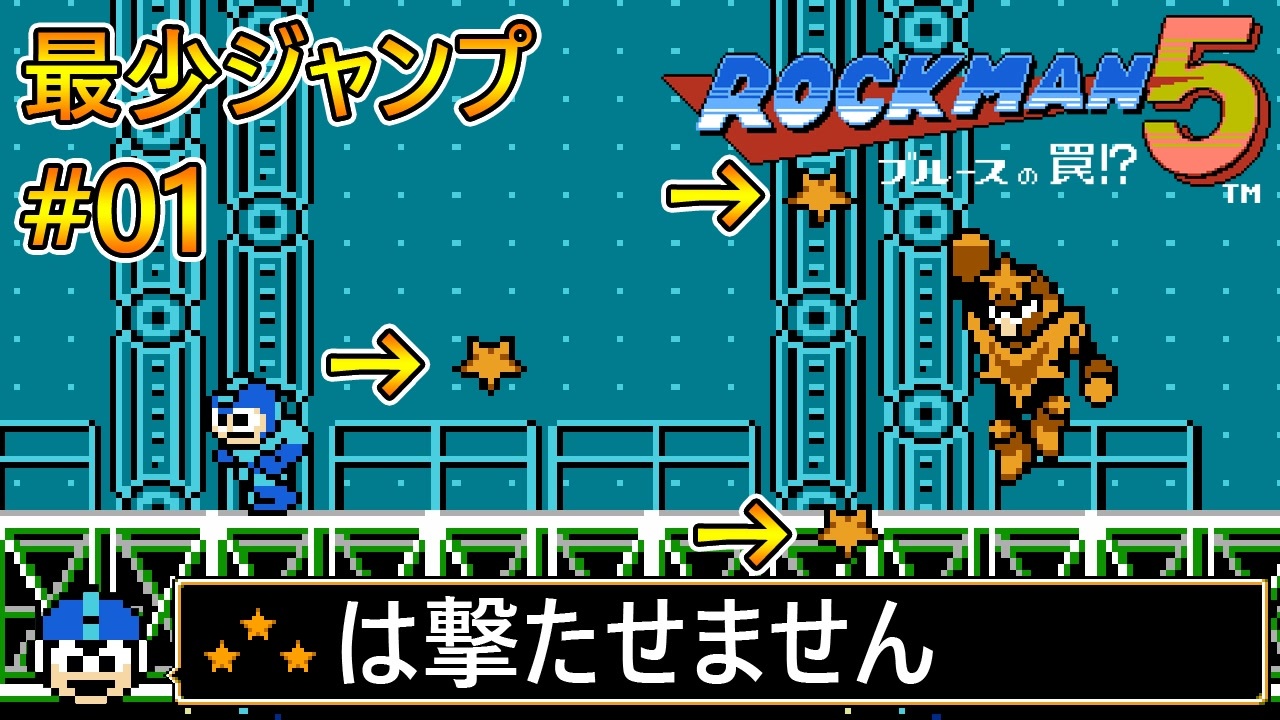 10年ぶりにロックマンのプレイ動画作りました<br><br>【目標】<br>ロックマン5を最少ジャンプ回数でクリアする<br><br>【条件】<br>1. 敵が落とす武器エネルギーによる「ラッシュコイル」「ラッシュジェット」「スーパーアロー」の回復を禁止<br>2. ティウン禁止<br>3. ビートプレートはすべて取得する<br><br>詳細は動画内の説明をご覧ください<br><br>【プレイ環境】<br>エミュレータ使用<br>各ステージクリア時にステートセーブ/ロードを使用<br>ステージ途中でのステートセーブ/ロードは不使用<br><br>Part2:<a href="https://www.nicovideo.jp/watch/sm40132257" class="watch">sm40132257</a><br>マイリスト:<a href="https://www.nicovideo.jp/mylist/72821417" target="_blank" rel="noopener">mylist/72821417</a><br><br>【twitter】<br><a href="https://twitter.com/humaretai" target="_blank" rel="noopener nofollow">https://twitter.com/humaretai</a><br><br>【YouTube】<br><a href="https://www.youtube.com/playlist?list=PLIMjzwm-kiihDUtiW6QGj83zai9eVExan" target="_blank" rel="noopener nofollow">https://www.youtube.com/playlist?list=PLIMjzwm-kiihDUtiW6QGj83zai9eVExan</a><br><br>© 1992 CAPCOM CO., LTD. ALL RIGHTS RESERVED.