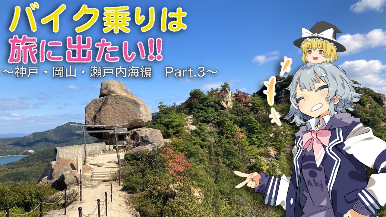 2022/3/7→サムネを変更しました。<br><br>今回は小豆島をめぐっていきます。<br>観光地が多く見所がたくさんあるので、一緒に旅に出ましょう!!<br>最後までお楽しみください!!<br><br>---編集後記---<br>前回から少し時間が空いてしまいました。<br>見やすさ向上のため、また少し新しい要素を加えました。<br>まだ、スタイルが確立できていないので今後も若干仕様が変わると思いますがお付き合いをいただけば。<br><br>---使用素材---<br>・小春六花立ち絵@からい様 → <a href="https://seiga.nicovideo.jp/seiga/im10775794" target="_blank" rel="noopener">im10775794</a><br>・ミニ小春六花立ち絵@ほり様 → <a href="https://seiga.nicovideo.jp/seiga/im10815482" target="_blank" rel="noopener">im10815482</a><br>・効果音、BGM<br> →効果音ラボ<br> →DOVA-SYNDROME<br> →ニコニコ・モンズ<br><br>---出演---<br>MarinAir<br>小春六花<br>YAMAHA Drugstar 400 Classic(2006年式)<br><br>○バイク乗りは旅に出たい<br>・神戸 岡山 瀬戸内編<br> 前 → <a href="https://www.nicovideo.jp/watch/sm39857761" class="watch">sm39857761</a><br> 次 → 未定