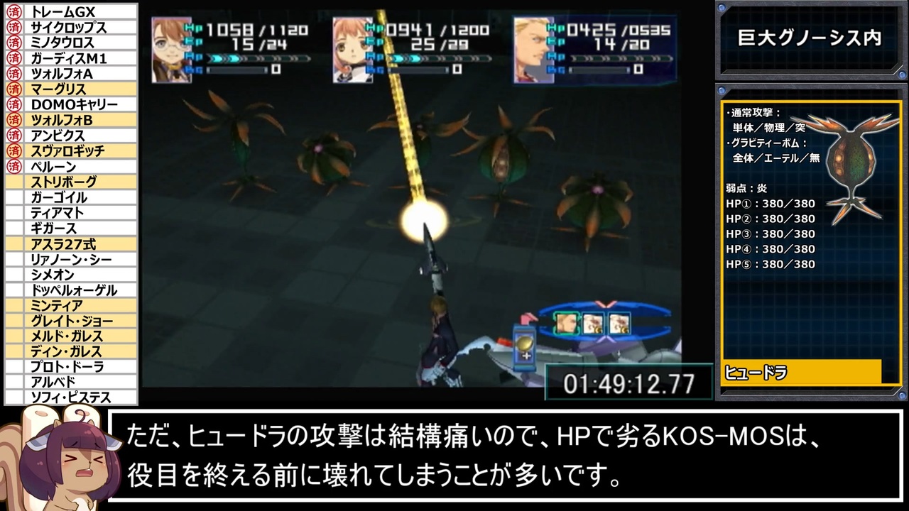 キメラ語録作ってるときが一番楽しい<br><br>ドックコロニー買い物~グノーシス内部途中まで<br><br><a href="https://www.nicovideo.jp/watch/sm40101075" class="watch">sm40101075</a>←前|<a href="https://www.nicovideo.jp/mylist/72710842" target="_blank" rel="noopener">mylist/72710842</a>|次→<a href="https://www.nicovideo.jp/watch/sm40152576" class="watch">sm40152576</a><br><br>本パートのムービーシーンはこちら→<a href="https://www.nicovideo.jp/watch/sm40117235" class="watch">sm40117235</a><br><br>RTA part1集 <a href="https://www.nicovideo.jp/mylist/71936684" target="_blank" rel="noopener">mylist/71936684</a><br><br><strong><u>▼お借りした素材達</u></strong><br>・【blueberry様】:東北リスたん素材 - <a href="https://seiga.nicovideo.jp/seiga/im6398652" target="_blank" rel="noopener">im6398652</a><br>・【インギンブレイ様】:解説枠(SF) - <a href="https://commons.nicovideo.jp/works/nc25831" target="_blank" rel="noopener">nc25831</a><br><br><strong><u>▼プレイ環境</u></strong><br>・本体(実機):SCPH-70000<br>・コントローラ:SCPH-10010<br>・ディスク:普通のやつ<br><br><strong><u>▼レギュレーション/縛り等</u></strong><br>・計測開始:PS2起動時<br>・計測終了:ラスボス(ソフィ・ピステス)の撃破ムービーが開始した瞬間<br>・バグ禁止<br>・任意戦闘を含む、全ての中ボス・隠しボスを倒してクリアする