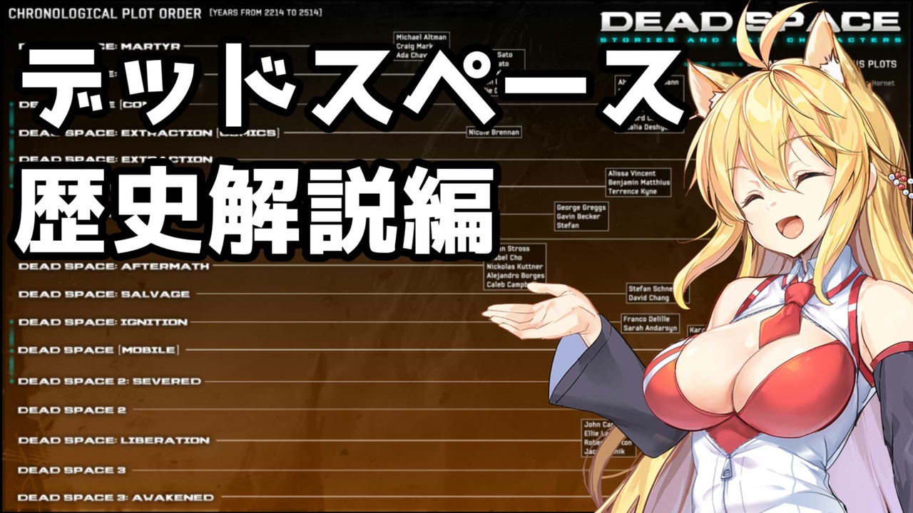 どうも皆さん、よこちーです。<br>今回からデッドスペース世界の歴史や出来事などの情報を<br>まとめた動画を投稿していこうと思います。<br><br>ゲーム以外の動画投稿は初めてなので至らない点があると思いますが<br>よろしくお願いします。<br><br>第一回目はデッドスペース3までの歴史を簡単にまとめてみました。<br>第二回目では各年代ごとに詳しく解説していきますのでよろしくお願いします。<br><br><a href="https://www.nicovideo.jp/watch/sm40028601" class="watch">sm40028601</a>←前回 次回→<a href="https://www.nicovideo.jp/watch/sm40246789" class="watch">sm40246789</a><br><br>・デッドスペース3part1(2017年投稿)⇒<a href="https://www.nicovideo.jp/watch/sm31283490" class="watch">sm31283490</a><br>・デッドスペース2part1(2021年投稿)⇒<a href="https://www.nicovideo.jp/watch/sm38354940" class="watch">sm38354940</a><br>・デッドスペース part1(2021年投稿)⇒<a href="https://www.nicovideo.jp/watch/sm39080252" class="watch">sm39080252</a><br>・初代デッドスペースマイリスト→<a href="https://www.nicovideo.jp/mylist/71430727" target="_blank" rel="noopener">mylist/71430727</a><br>各part1マイリスト→<a href="https://www.nicovideo.jp/mylist/59931747" target="_blank" rel="noopener">mylist/59931747</a><br><br>いつもお世話になっている先生たち<br><br>・立ち絵<br><br>〇アジシオ様<br>弦巻マキ(<a href="https://seiga.nicovideo.jp/seiga/im10593538" target="_blank" rel="noopener">im10593538</a>)<br><br>・BGM<br>〇むつき醒様<br><br>素材<br><br>いらすとや様より一部お借りしてます<br>効果音ラボ様より一部お借りしてます<br><br>動画の進捗とかいろいろつぶやいてます。<br>検索で引っかからない場合はお手数ですがこちらからどうぞ。<br>⇒【Twitter】⇒<a href="https://twitter.com/yukamaki5656" target="_blank" rel="noopener nofollow">https://twitter.com/yukamaki5656</a><br><br>過去の動画とかをたまにyoutubeに上げてます。<br>もしよろしければ高評価&チャンネル登録をお願いします。<br>⇒<a href="https://www.youtube.com/channel/UCZo_zA7_xQkimatzi4TlOow" target="_blank" rel="noopener nofollow">https://www.youtube.com/channel/UCZo_zA7_xQkimatzi4TlOow</a>