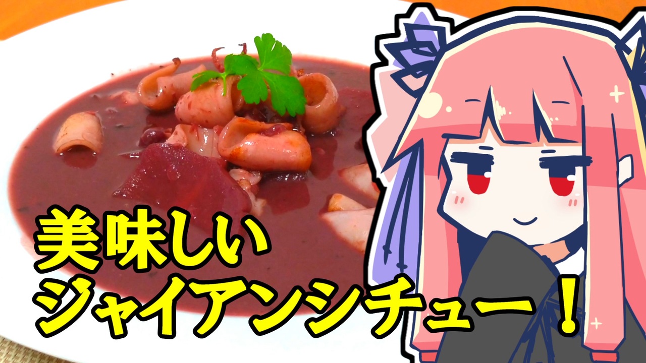<br>ジャイアンシチューを2度作った、初めての人類かもしれません。<br><br>3度目は...大福が苦手なので無いと思います。<br><br>※無塩バターを使用しています。<br><br><br>【材料(1人前、指示無き量は適量)】<br>・イカ(刺身用)<br>・塩<br>・酒<br>・みりん<br>・たくあん<br>・煮干し出汁(150ml目安)<br>・香味野菜(計30g目安)<br>・鶏ひき肉(皮を除いて70g目安)<br>・赤ワイン 300mlくらい<br>・大福(無ければ無いほどよい)<br>・油<br>・ブルーベリージャム<br>・赤ワインビネガー<br>・塩胡椒<br>・バター5gほど<br>・イタリアンパセリ(あれば)<br><br><br>前回→<a href="https://www.nicovideo.jp/watch/sm40032627" class="watch">sm40032627</a><br>茜「製菓が苦手なのでフォワグラのムースショコラ~チロルチョコを添えて~を作ります」【このバレ】<br><br /><br>一人きりでもご馳走を→<a href="https://www.nicovideo.jp/mylist/71166308" target="_blank" rel="noopener">mylist/71166308</a><br>今宵の粗餐は求道系→<a href="https://www.nicovideo.jp/mylist/74361825" target="_blank" rel="noopener">mylist/74361825</a><br>単発動画マイリス→<a href="https://www.nicovideo.jp/mylist/71820554" target="_blank" rel="noopener">mylist/71820554</a><br><br>ついった→<a href="https://twitter.com/Yondewaru" target="_blank" rel="noopener nofollow">https://twitter.com/Yondewaru</a>