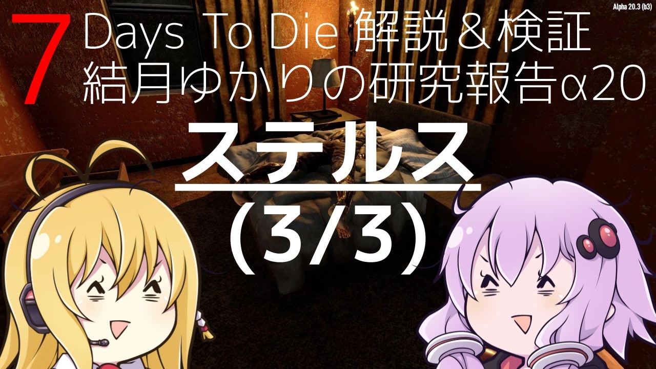 7 Days To Dieの解説と検証を行う動画で、ステルス編の最終回です。<br>今回はスリーパーとスリーパーボリューム、ステルスチェックを扱っています。<br><br><a href="#" class="seekTime" data-seekTime="0:20" onclick="seekNicoPlayer('#0:20'); return false;">#0:20</a> スリーパー<br><a href="#" class="seekTime" data-seekTime="1:28" onclick="seekNicoPlayer('#1:28'); return false;">#1:28</a> スリーパーボリューム<br><a href="#" class="seekTime" data-seekTime="5:21" onclick="seekNicoPlayer('#5:21'); return false;">#5:21</a> ステルスチェック<br><br>※尺と編集の都合により、コメント返しと広告者様紹介はコメ返し回に行います。<br><br>【注意】<br>本動画は7 Days To Die α20.3(バニラ)について解説しています。<br>解説にあたって、ネタバレ、チート・デバッグモードの多用、<br>内部データであるXMLを参照、難易度設定等を頻繁に変更します。<br>御用のある方は下記問合せフォームからご連絡頂けると幸いです。<br><a href="https://forms.gle/q2f6gDU1R6RNrWJP7" target="_blank" rel="noopener nofollow">https://forms.gle/q2f6gDU1R6RNrWJP7</a><br><br>次 → 2~3日後<br><br>【使用ツール】<br>AviUtl<br>L-SMASH Works<br>かんたんMP4出力<br>ごちゃまぜドロップス<br>PSDToolKit<br><br>【エラータ】<br>何かあれば追記します