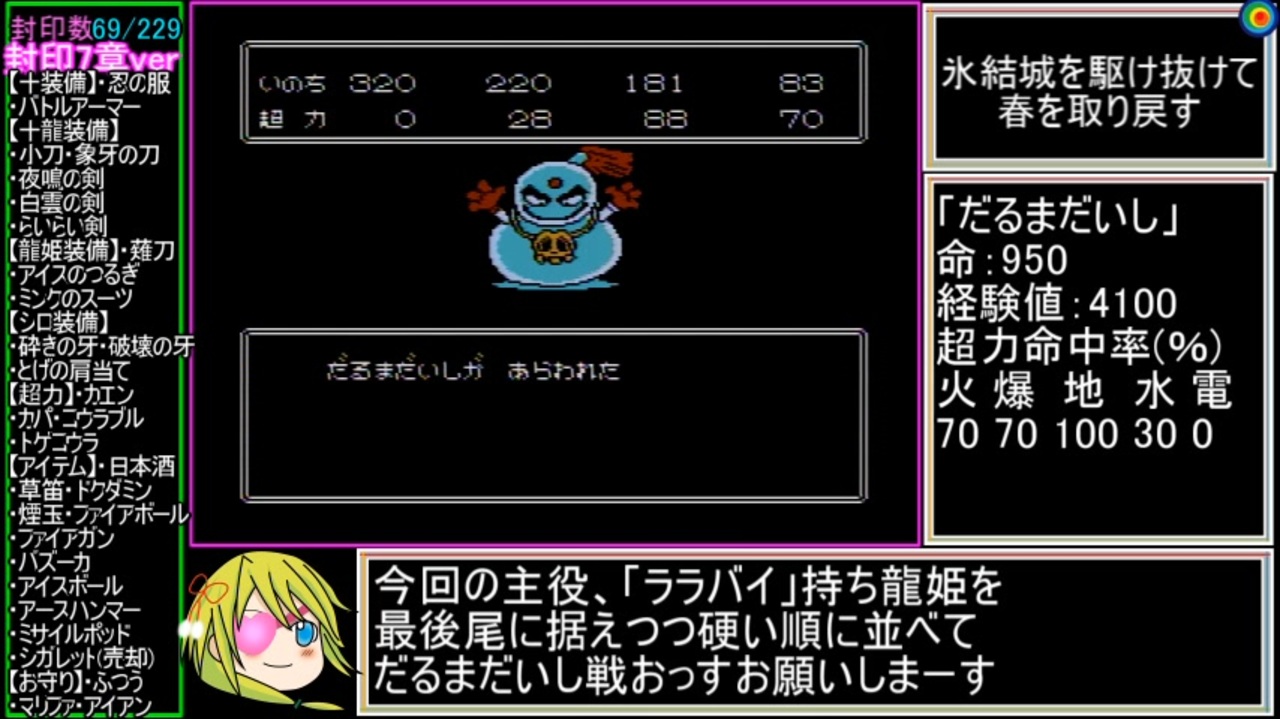 親の動画で幾度となく見ただるまだいし戦<br><br>☆縛り内容☆<br>①レベルアップごとに超力・剣技・アイテム・装備が封印(奇数レベルになったら2封印)<br>②じゅうべえウォーク可(逃走および雑魚吟味、ボス戦で負けてリセットも可)<br>③システム上回避不可事項については緩和措置あり<br>④経験値の絡んだリセット禁止(ドロップを見てからのリセット)<br>⑤編集は頑張らない(やりたいようにはやる)<br><br>☆備考(上記③の詳細含む)☆<br>・装備変更不可時に装備物が封印された場合、代わりに1封印捧げて以降の使用を可とする(任意)<br>・封印済み装備の下取り代不問<br>・封印されたロバロバの中身チェックは江戸到達時と必須戦闘時のみとする<br>・露骨な難易度破壊は禁止(げんない解禁時点で封印前に30万両錬金しておく等)<br>・連戦時は最後にまとめて封印を行う<br>・その他諸々は基本テンポ重視、面白さ重視で<br>・まだ封印されていない対象物は出来るだけ「」で表記する<br>・一部アイテム無限取得バグは禁止<br><br>part1→<a href="https://www.nicovideo.jp/watch/sm38924604" class="watch">sm38924604</a><br>前→<a href="https://www.nicovideo.jp/watch/sm40000728" class="watch">sm40000728</a><br>次→<a href="https://www.nicovideo.jp/watch/sm40360530" class="watch">sm40360530</a>