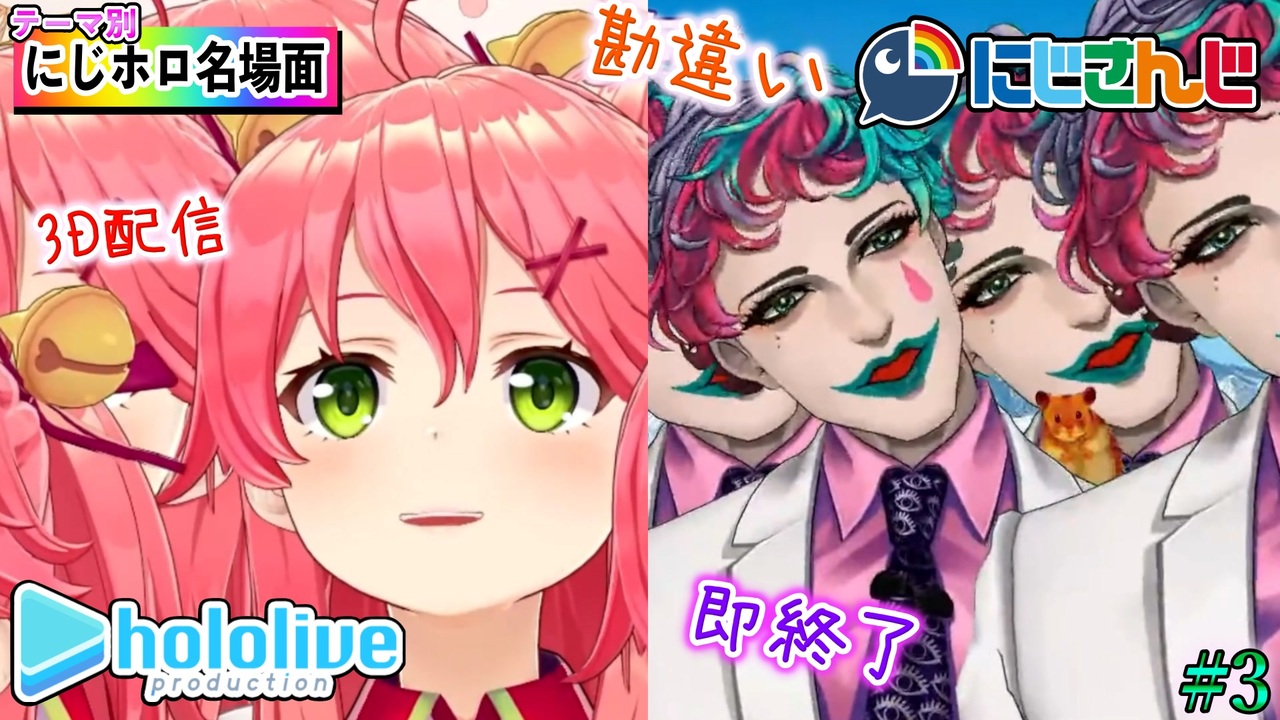 その2→<a href="https://www.nicovideo.jp/watch/sm40070265" class="watch">sm40070265</a><br>その4→<a href="https://www.nicovideo.jp/watch/sm40201660" class="watch">sm40201660</a><br><br>ホロライブとにじさんじの名場面や面白いシーンのテーマ別まとめです<br>今回のテーマ:【勘違い】【3D配信】【即終了】<br><br><a href="#" class="seekTime" data-seekTime="0:00" onclick="seekNicoPlayer('#0:00'); return false;">#0:00</a> 面白い勘違い<br><br><a href="#" class="seekTime" data-seekTime="3:14" onclick="seekNicoPlayer('#3:14'); return false;">#3:14</a> 3Dの面白シーン<br><br><a href="#" class="seekTime" data-seekTime="8:14" onclick="seekNicoPlayer('#8:14'); return false;">#8:14</a> 即終了<br><br>にじホロ両方好きなので作りました<br><br>文字数制限の為元動画はYouTube版にて<br>→<a href="https://youtu.be/YoJVJeVpHXc" target="_blank" rel="noopener nofollow">https://youtu.be/YoJVJeVpHXc</a><br><br><br><span style="color: #b7b7b7;">▷</span><span style="color: #b7b7b7; font-size: 10px;">Vつべの助かる切り抜き(YouTube)→<a href="http://www.youtube.com/channel/UCTk7oeLeSCOO4Kb14-pHWYA" target="_blank" rel="noopener nofollow">http://www.youtube.com/channel/UCTk7oeLeSCOO4Kb14-pHWYA</a></span>