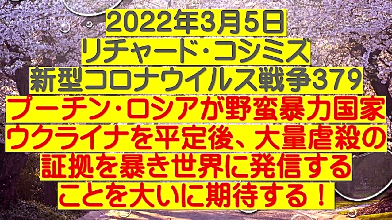 <span style="color: #cc4125;"><strong>【 テーマ:新型コロナウイルス戦争 379 】</strong></span><br><br><span style="color: #ff0000;"><strong>「 プーチン・ロシアが野蛮暴力国家ウクライナを平定後、『 大量虐殺の証拠を暴き世界に発信する 』<br> ことを大いに期待する!」</strong></span><br><br> ◆DEEP STATE裏社会が、新型コロナの次に、新たな強毒ウイルスを蔓延させ、それを口実に殺人<br> ワクチン接種を全球規模で強制してくることを危惧する。<br><br> ◆KGB(旧ソ連国家保安委員会)出身のプーチン氏が、同様の危惧を持ち情報を収集して、ウクラ<br> イナ国内のユダヤ米国&イスラエルの研究所の「狂犬病」・「マールブルグ病」ウイルスの開発<br> を察知した可能性がある。その結果が、生物兵器研究所へのミサイル攻撃では?<br><br> ◆プーチン氏には、ウクライナ平定後の早い時期に、現地で見つけた「犯罪の証拠」を暴露して頂<br> きたい。大量虐殺の証拠を!<br><br> ◆プーチン氏に悪印象を与える目的の加工画像などを使い、イメージ作戦。「メディアが、DEEP <br> STATE裏社会の奴隷である」と自ら露呈。<br><br> ◆ワクチンにコロナの感染予防効果はない。むしろ、ワクチンを打ったほうが、オミクロン株に感<br> 染しやすくなる。<br><br><br><span style="color: #38761d;">◆</span><span style="color: #38761d;"><strong>リチャード・コシミズ 公式 ブログ</strong></span><br> <a href="https://ameblo.jp/richardneversurrender/" target="_blank" rel="noopener nofollow">https://ameblo.jp/richardneversurrender/</a><br><br><span style="color: #38761d;">◆</span><span style="color: #38761d;"><strong>リチャード・コシミズ 公式 ホームページ</strong></span><br> <a href="http://richardkoshimizu.boo.jp/" target="_blank" rel="noopener nofollow">http://richardkoshimizu.boo.jp/</a><br><br><span style="color: #38761d;">◆</span><span style="color: #38761d;"><strong>リチャード・コシミズ 講演会 公式 動画ギャラリー</strong></span><br> <a href="http://www.t-sskk.com/richardkoshimizu/video-gallery/index.html" target="_blank" rel="noopener nofollow">http://www.t-sskk.com/richardkoshimizu/video-gallery/index.html</a><br>
