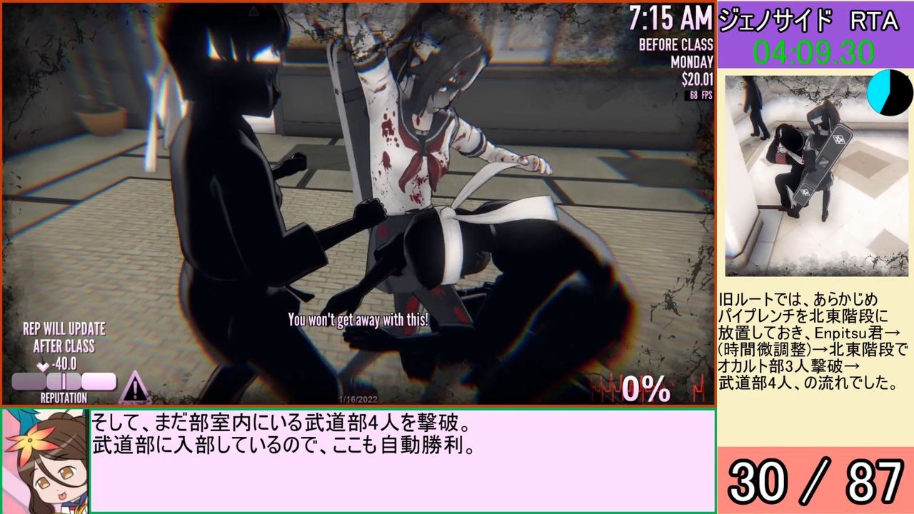 ジェノサイドのRTAとなります。<br><br>ヤンデレシミュレーターでのジェノサイドは昼休憩も使うルートが主流ですが、<br>朝の時間帯だけで達成できないか挑戦したくなり、試してみました。<br>その結果、RTAになりました。ルートも大分面白くかつ綺麗にまとまったと思います。<br><br>昼休憩時間を使っているだち氏の12分43秒の記録(<a href="https://www.nicovideo.jp/watch/sm39814822" class="watch">sm39814822</a>)から1分42秒更新しました。<br>あと1秒ちょっと早ければ11分切りできたのが悔しい。<br><br>speedrun.comに投稿したところ、無事に承認されて1位になりました!<br>タイマーだけ付けた版(記録提出用の動画)→<a href="https://youtu.be/3L7hmyA2bBg" target="_blank" rel="noopener nofollow">https://youtu.be/3L7hmyA2bBg</a><br><br>ルートの最序盤に関して、LABO405氏の「お手軽ジェノサイド」(<a href="https://www.nicovideo.jp/watch/sm39387204" class="watch">sm39387204</a>)を参考にしています。<br>なお、現在は仕様変更により、<br>「お手軽ジェノサイド」のように生徒達を大量に教室に避難させてから一気に刈り取る方法は使えません。<br>個人的には、単純な刈り取り作業よりもルート構築とかが楽しめる方が好き。<br><br>YouTubeにも同じ内容で投稿しました。→<a href="https://youtu.be/N1z_ScAEEmc" target="_blank" rel="noopener nofollow">https://youtu.be/N1z_ScAEEmc</a><br><br>=====<br>●レギュレーション<br>ジェノサイド<br>●計測区間<br>空のファイルを選択~87人倒して暗転した後、Senpaiのセリフが表示されるまで<br>(speedrun.comのルールに従い、ロード時間は含めない)<br><br><br>ヤンシミュ関連の投稿動画のリスト→<a href="https://www.nicovideo.jp/mylist/72089605" target="_blank" rel="noopener">mylist/72089605</a><br><br>=====<br>アルファベットキラーに関して、<br>一部生徒の初期位置がおかしい問題が発生していましたが、<br>最近のアプデにより、修正されたようです。<br>(1980年代の男子たちはまだおかしかったけど)<br><br>nightmare含めルートの研究を進めたいところなのですが、<br>しばらくは資格試験の勉強とかの方を優先します。<br>