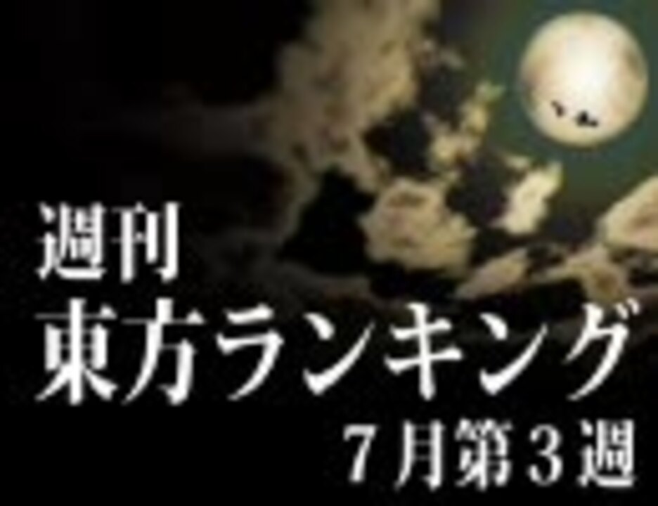 7月第3週作品リスト[<a href="https://www.nicovideo.jp/mylist/7615403" target="_blank" rel="noopener">mylist/7615403</a>]<br /><br />【集計期間】 7月第3週 7/12 0:00-7/19 0:00<br />【対象作品】 東方タグがある作品(27,705件)、タイトルに東方が入っている作品(21,837件)<br />【集計方法】 ポイント数=(再生数÷20)+マイリスト数<br /><br />・自動的に次の作品にとぶようになっている一連の作品は一つの作品とみなします。<br />・除外作品は基本的にZIP配布(自作品配布は除く)か東方と全く関係ない作品とします。<br />・3回以上ランクインした作品は時間を短縮し、下位の作品を追加して紹介します。<br /><br />[<a href="https://www.nicovideo.jp/watch/sm3946595" class="watch">sm3946595</a>]←7月第2週 7月第4週→[<a href="https://www.nicovideo.jp/watch/sm4089942" class="watch">sm4089942</a>]<br /><br />ご意見・ご要望等はこちらの掲示板か管理人宛メールで→<a href="http://www2.atchs.jp/toho/" target="_blank" rel="noopener nofollow">http://www2.atchs.jp/toho/</a><br />RSS→<a href="http://www5.atpages.jp/tohonico/" target="_blank" rel="noopener nofollow">http://www5.atpages.jp/tohonico/</a><br />軽量版→[<a href="https://www.nicovideo.jp/watch/sm4015152" class="watch">sm4015152</a>]<br />