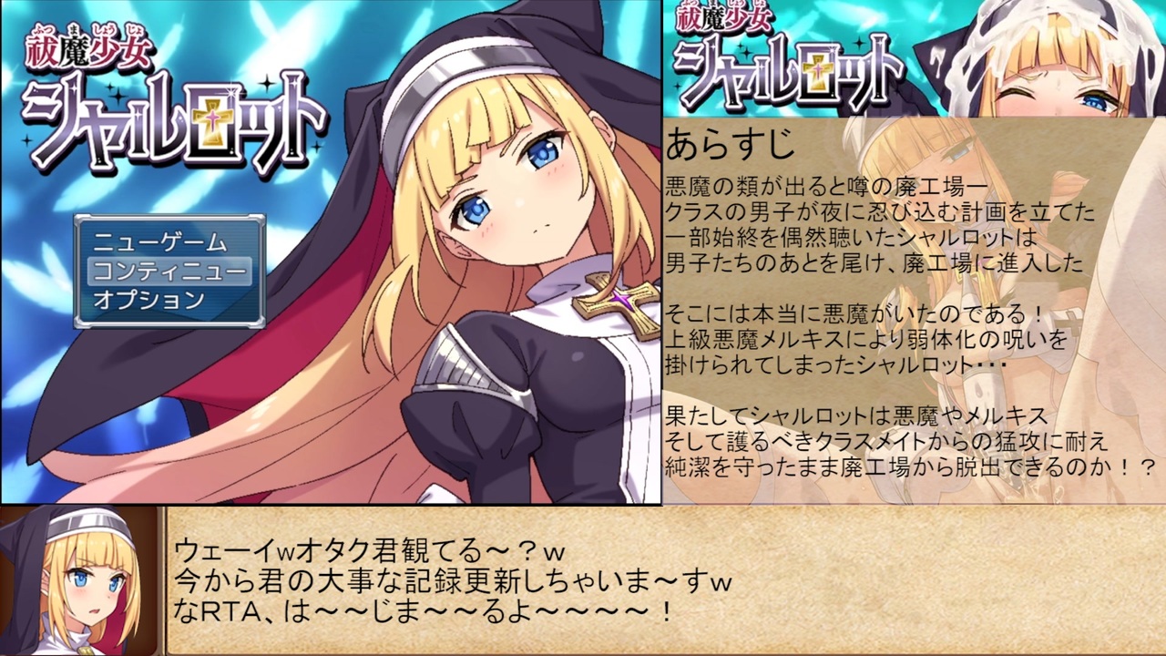 お前が休んでる時、俺はオナニーしている。<br>お前が寝ている時、俺はオナニーしている。<br>お前がオナニーしている時、もちろん俺はもっと激しくオナニーしている。<br><br>by フロイド・メイウェザー・ジュニア<br><br><span style="color: #ff0000; font-size: 24px;"><strong>祝!30分切り!</strong></span><br><br>【No Future】様制作<br>「祓魔少女シャルロット」ラスボス撃破までのRTAの再走をさせて頂きました。<br><br>○~あらすじ~○<br><br>クラスメイトを救うために立ち上がった歴戦のエクソシスト シャルロット、<br>しかし一瞬の隙を突かれて弱体化の呪いを掛けられてしまった!<br>敵拠点の中心で敵の猛攻に耐え、悪魔を祓え!<br>果たしてシャルロットは純潔を守ったままクラスメイトを救い、<br>上級悪魔「メルキス」を倒すことができるのか!?<br><br><br><br>作品リンクはこちら!買うなら今!!<br><br><span style="color: #ff0000; font-size: 18px;"><strong><i>祝!!「祓魔少女シャルロット」販売数30,400本突破!!</i></strong></span><span style="color: #ff0000; font-size: 18px;"><strong>!</strong></span><br><br><br>美少女シスター陵辱RTAマイリスト→<a href="https://www.nicovideo.jp/mylist/71433234" target="_blank" rel="noopener">mylist/71433234</a><br>ドスケベくノ一陵辱RTAマイリスト→<a href="https://www.nicovideo.jp/mylist/71433237" target="_blank" rel="noopener">mylist/71433237</a><br>美少女エスパー陵辱RTAマイリスト→<a href="https://www.nicovideo.jp/mylist/71453605" target="_blank" rel="noopener">mylist/71453605</a><br>正義の魔法少女陵辱RTAマイリスト→<a href="https://www.nicovideo.jp/mylist/72027465" target="_blank" rel="noopener">mylist/72027465</a><br>ムチムチな天使陵辱RTAマイリスト→<a href="https://www.nicovideo.jp/mylist/72196860" target="_blank" rel="noopener">mylist/72196860</a><br>正義のヒロイン陵辱RTAマイリスト→<a href="https://www.nicovideo.jp/mylist/72424512" target="_blank" rel="noopener">mylist/72424512</a><br><br>Twitter ID→@Duce_Ishizawa
