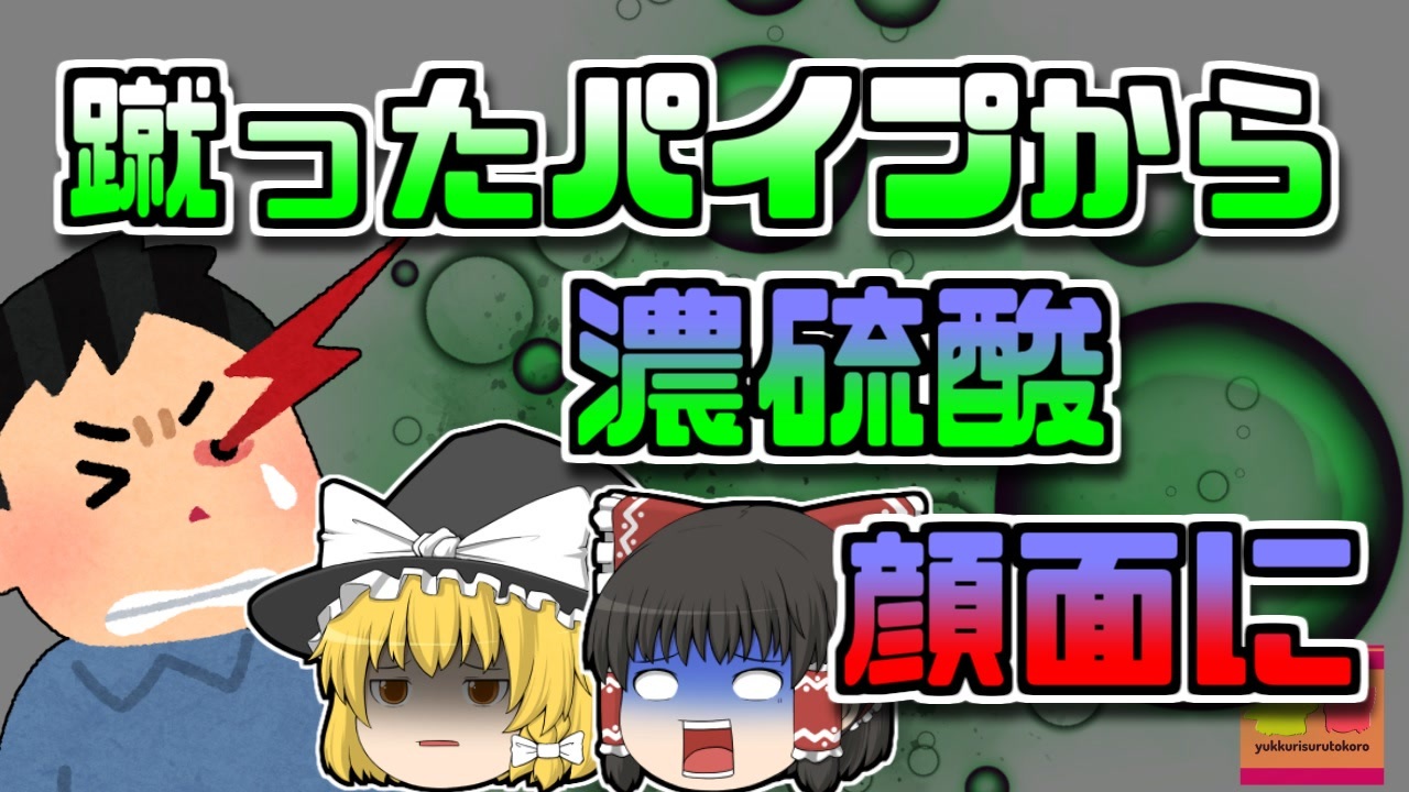 #ゆっくりするところ #静岡県 #濃硫酸<br>今回紹介するのは、以前からリクエストがありました「濃硫酸」にお関する事例です。<br>静岡県富士市では、昔から紙の製造が盛んであり、数多くの製紙工場が建設されていました。<br>その数ある工場の中の一つではこの日、紙を製造するために使用する、「濃硫酸」をためるタンクのパイプ交換作業が行われていました。<br>この作業は、製紙会社が下請け会社に依頼した物であり、Aさんはこの下請け会社の作業員でした。<br><br>この作業は四名で行われ、Aさんはパイプを交換するため、配管の接続部、フランジ部分をこじ開けようとしていました。<br>しかし、ドライバーなどでも中々こじ開けることができなかったため、彼は足でこのパイプを強く蹴り、ずらしてこじ開けようとしました。<br>すると、思っていたよりもずっとパイプは簡単に変形してしまい、その一部から、中身の濃硫酸が勢いよく、シャワーの様にAさんに向かって飛び出してきたのです。<br><br>引用:出展:参考資料<br>Wikipedia<br>ishort.ink/29FJ<br>大分製紙㈱<br>ishort.ink/a4y9<br>株式会社保科製作所<br>ishort.ink/Cwn4<br>J-Stage<br>ishort.ink/ygPm<br><br><br />※この動画は過去の事件を知り、現在でも同じことが発生する危険性を再認識、関与しないように促すための動画であり、視聴者を扇動、動揺を誘うためのコンテンツではありません。<br><br>ご要望にお応えして、メンバーシップの開設を行いました。<br>下記URLからも登録可能ですので、ご興味がある方は是非ご参加ください。<br><a href="https://www.youtube.com/channel/UCcT5a1J7XJW7CLYI2RKl4pw/join" target="_blank" rel="noopener nofollow">https://www.youtube.com/channel/UCcT5a1J7XJW7CLYI2RKl4pw/join</a><br><br><br>Twitter<br>→<a href="https://twitter.com/yukkurisurutoko" target="_blank" rel="noopener nofollow">https://twitter.com/yukkurisurutoko</a><br><br>取り急ぎ、簡易的にですがマイリストを作りました。<br>【ゆっくり解説】事故・事件関係紹介リスト <br><a href="https://www.nicovideo.jp/mylist/71034319" target="_blank" rel="noopener nofollow">https://www.nicovideo.jp/mylist/71034319</a><br>【ゆっくり解説】放射線系事故<br><a href="https://www.nicovideo.jp/mylist/71034368" target="_blank" rel="noopener nofollow">https://www.nicovideo.jp/mylist/71034368</a><br>【ゆっくり解説】鉄道系事故・事件関連<br><a href="https://www.nicovideo.jp/mylist/71034379" target="_blank" rel="noopener nofollow">https://www.nicovideo.jp/mylist/71034379</a>