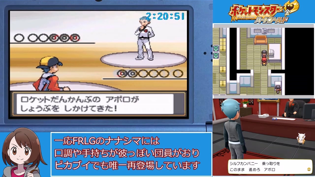 終わりが見えてきました<br>前:<a href="https://www.nicovideo.jp/watch/sm40094873" class="watch">sm40094873</a><br>次:<a href="https://www.nicovideo.jp/watch/sm40208022" class="watch">sm40208022</a><br>〈基本ルール〉<br>ワタル撃破のRTA<br>「だいじょうぶ」を選択した瞬間計測開始。「THE END」で計測終了。<br>バグ技禁止<br>通信はゲーム内NPCのみ可<br>計測終了時に『ひきゃく』の戦闘回数が一番多い<br>※『ひきゃく』はコガネシティの北ゲートで入手できる『オニスズメ』を指す<br><br>・けいさん作のひきゃくチャートを参考にさせていただきました<br>ブロマガがサービス終了してるのでリンクは無いです…<br>・左下はムエド兄貴に描いていただいたものです