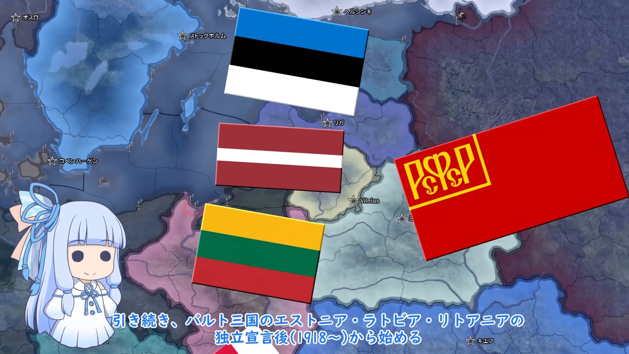 葵「以下の三部で構成する予定です、とか言ってたらもっと増えそう」<br><br>1.バルト三国の誕生(~1918)<br>2.独立戦争(1918~1920)←<br>3.苦難と再独立の時代(1920~1945~1991)<br>4.バルト三国とNATO拡大(1991~)<br><br>次:<a href="https://www.nicovideo.jp/watch/sm40176622" class="watch">sm40176622</a><br><br>+α:<a href="https://twitter.com/Fuyuzuki4" target="_blank" rel="noopener nofollow">https://twitter.com/Fuyuzuki4</a>