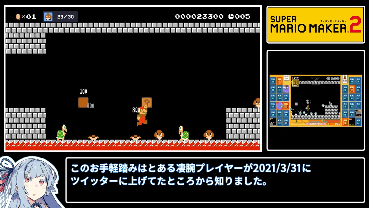 近いうちにと宣言したので初速攻です。<br>葵ちゃんはやればできる子なんです。<s>(そんなに早くない)</s><br>ちなみにクリアチェック時間は18.666秒でした。<br><br><br><span style="font-size: 24px;">【SMB35】 1-4最速赤タイマー / fastest red<br>LBT-MVY-RHG</span><br><br><br><br>いいねにちょっとした余談を書いておきます<br><br><br><br><br>前:<a href="https://www.nicovideo.jp/watch/sm40138300" class="watch">sm40138300</a>(1-3) 次:2-1か5-1(本編とか他のを終わらせてから)<br><br>本編(トップランカー茜ちゃんのマリオ35実況) → <a href="https://www.nicovideo.jp/watch/sm38514566" class="watch">sm38514566</a><br><br>マリオ35メーカー2の動画:<a href="https://www.nicovideo.jp/mylist/72532086" target="_blank" rel="noopener">mylist/72532086</a><br>今まで作った動画:<a href="https://www.nicovideo.jp/mylist/60661860" target="_blank" rel="noopener">mylist/60661860</a>
