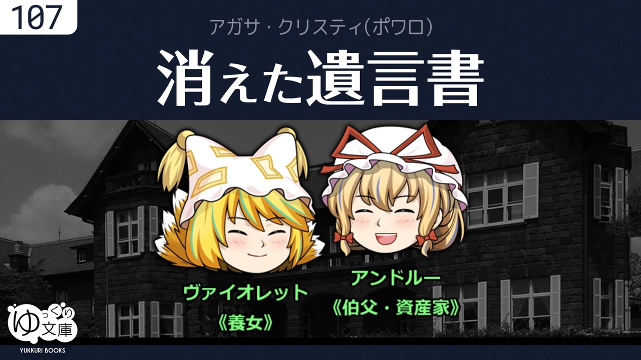 <span style="color: #ff0000;"><strong>107 伯父の遺志は──</strong></span><br>ミス・ヴァイオレットは叔父の遺産を相続したが、一年以内に謎を解かないと失ってしまうことに。彼女は自分なりに探してみたが、行き詰まり、ポワロに相談した。<br><span style="color: green;">The Case of the Missing Will (1923) by Agatha Christie </span><br><br>(うp主より)やっぱ短編はイイ。同じ尺でも長編の100倍らくちん。でも新素材の調整は大変。試験運用に付き合ってくれ。<br><br>●ゆっクリスティ <a href="https://www.nicovideo.jp/mylist/59497715" target="_blank" rel="noopener">mylist/59497715</a><br>◆ミス・マープル<br><a href="https://www.nicovideo.jp/watch/sm24238713" class="watch">sm24238713</a> 完璧なメイド<br><a href="https://www.nicovideo.jp/watch/sm25512772" class="watch">sm25512772</a> 動機と機会<br><a href="https://www.nicovideo.jp/watch/sm26942176" class="watch">sm26942176</a> 青いゼラニウム<br><a href="https://www.nicovideo.jp/watch/sm30507320" class="watch">sm30507320</a> ポケットにライ麦を #1<br><a href="https://www.nicovideo.jp/watch/sm30511824" class="watch">sm30511824</a> #2<br><a href="https://www.nicovideo.jp/watch/sm30512247" class="watch">sm30512247</a> #3<br><a href="https://www.nicovideo.jp/watch/sm32946182" class="watch">sm32946182</a> パディントン発4時50分 #1<br><a href="https://www.nicovideo.jp/watch/sm38609548" class="watch">sm38609548</a> # 原作に近い版<br><a href="https://www.nicovideo.jp/watch/sm33091342" class="watch">sm33091342</a> 鏡は横にひび割れて<br><a href="https://www.nicovideo.jp/watch/sm37048244" class="watch">sm37048244</a> 予告殺人 #1 殺人のお知らせ<br><a href="https://www.nicovideo.jp/watch/sm37064125" class="watch">sm37064125</a> #2 ゲドラーの遺産<br><a href="https://www.nicovideo.jp/watch/sm37075231" class="watch">sm37075231</a> #3 甘美なる死<br><a href="https://www.nicovideo.jp/watch/sm37088256" class="watch">sm37088256</a> #4 やさしい殺人者<br><a href="https://www.nicovideo.jp/watch/sm37202036" class="watch">sm37202036</a> #ドラ・バンナーは間違っていたか?<br><br>◆ポワロ<br><a href="https://www.nicovideo.jp/watch/sm25458371" class="watch">sm25458371</a> スズメバチの巣<br><a href="https://www.nicovideo.jp/watch/sm38918082" class="watch">sm38918082</a> オリエント急行の殺人:0 予告編<br><a href="https://www.nicovideo.jp/watch/sm38924413" class="watch">sm38924413</a> #1<br><a href="https://www.nicovideo.jp/watch/sm39365170" class="watch">sm39365170</a> ナイルに死す #1 愛がすべて<br><a href="https://www.nicovideo.jp/watch/sm39367017" class="watch">sm39367017</a> #2 まわりは敵ばかり<br><a href="https://www.nicovideo.jp/watch/sm39368986" class="watch">sm39368986</a> #3 終わりにしよう<br><a href="https://www.nicovideo.jp/watch/sm40164143" class="watch">sm40164143</a> <span style="color: #ff00ff;"><strong>消えた遺言書</strong></span><br><br>◆ほか<br><a href="https://www.nicovideo.jp/watch/sm33975066" class="watch">sm33975066</a> そして誰もいなくなった (全2話+PV)<br><a href="https://www.nicovideo.jp/watch/sm42967435" class="watch">sm42967435</a> 招かれざる客 (全3話)<br><br>●ゆっくり文庫について<br>全部:<a href="https://www.nicovideo.jp/mylist/74874627" target="_blank" rel="noopener">mylist/74874627</a><br>近況:<a href="https://twitter.com/trynext" target="_blank" rel="noopener nofollow">https://twitter.com/trynext</a><br>---<br><br><br>