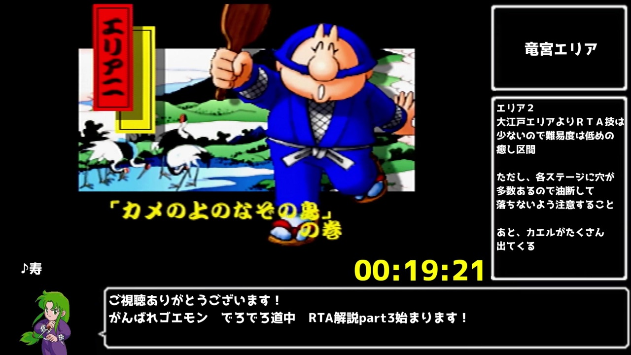 前⇒<a href="https://www.nicovideo.jp/watch/sm40122642" class="watch">sm40122642</a><br>次⇒<a href="https://www.nicovideo.jp/watch/sm40187116" class="watch">sm40187116</a><br>マイリスト⇒<a href="https://www.nicovideo.jp/mylist/72797482" target="_blank" rel="noopener">mylist/72797482</a><br><br>竜宮エリア道中<br>今回からみんな大好きヤエちゃんが登場します!<br>また、以降はキャラチェンジはないのでここからクリアまでがんばれヤエちゃんでろでろ道中~オバケてんこ盛り~となります!<br><br>また、今回の解説で出てくるRTA技やバグについては別の動画(<a href="https://www.nicovideo.jp/watch/sm40071366" class="watch">sm40071366</a>)にて説明しており、こちらをご視聴いただいた前提でRTA解説をしております。<br><br><br>計測開始:ゲームをリセットした瞬間<br>計測終了:ラスボスのドウチュウ鬼を撃破し画面がホワイトアウトした瞬間<br><br>普段はTwitch( <a href="https://www.twitch.tv/koryuta_dayo" target="_blank" rel="noopener nofollow">https://www.twitch.tv/koryuta_dayo</a> )にてRTA配信をやっています<br>この動画をきっかけに、普段のRTA配信にも興味を持っていただけたら幸いです<br><br>ゴエモンRTA用のdiscordのサーバーを作ってみました!<br>(64作品が主ですが)ゴエモンRTAについて詳しく知りたい方はご利用ください!<br>⇒<a href="https://discord.gg/s2dV7XjPJS" target="_blank" rel="noopener nofollow">https://discord.gg/s2dV7XjPJS</a><br><br>