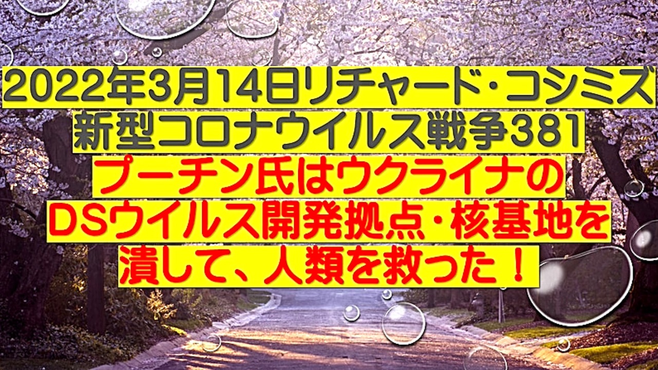 <span style="color: #cc4125;"><strong>【 テーマ:新型コロナウイルス戦争 381 】</strong></span><br><br><span style="color: #ff0000;"><strong>「 ウラジーミル・プーチン氏は、『 ウクライナのDEEP STATEウイルス開発拠点・核基地 』を潰して、<br> 人類を救った!」<br><br> </strong></span>◆DEEP STATE裏社会は、ワクチン接種者に対し、ワクチン副反応・後遺症を目的としているのではない。<br> ワクチンは、接種者を殺すのが目的の「生物兵器」である。<br><br> ◆DEEP STATE 裏社会が、何故、ここ迄、コロナワクチン接種を強行するのか?<br> 理由は、ハザール大富豪たちの命運がかかっているからである。<br><br> ◆米国DEEP STATE裏社会は、ウクライナでコロナ生物兵器を開発していた。<br> ウクライナは、DEEP STATEの完全属国であるから、人体実験が可能である。<br><br> ◆コロナワクチンの全世界戦略に失敗した米国DEEP STATEは、強毒ウイルスの投入・毒ワクチン接種を<br> 必要としていた。<br><br> ◆ウラジーミル・プーチン氏は、紛れもなく救世主である。<br><br><span style="color: #38761d;">◆</span><span style="color: #38761d;"><strong>リチャード・コシミズ 公式 ブログ</strong></span><br> <a href="https://ameblo.jp/richardneversurrender/" target="_blank" rel="noopener nofollow">https://ameblo.jp/richardneversurrender/</a><br><br><span style="color: #38761d;">◆</span><span style="color: #38761d;"><strong>リチャード・コシミズ 公式 ホームページ</strong></span><br> <a href="http://richardkoshimizu.boo.jp/" target="_blank" rel="noopener nofollow">http://richardkoshimizu.boo.jp/</a><br><br><span style="color: #38761d;">◆</span><span style="color: #38761d;"><strong>リチャード・コシミズ 講演会 公式 動画ギャラリー</strong></span><br> <a href="http://www.t-sskk.com/richardkoshimizu/video-gallery/index.html" target="_blank" rel="noopener nofollow">http://www.t-sskk.com/richardkoshimizu/video-gallery/index.html</a><br>