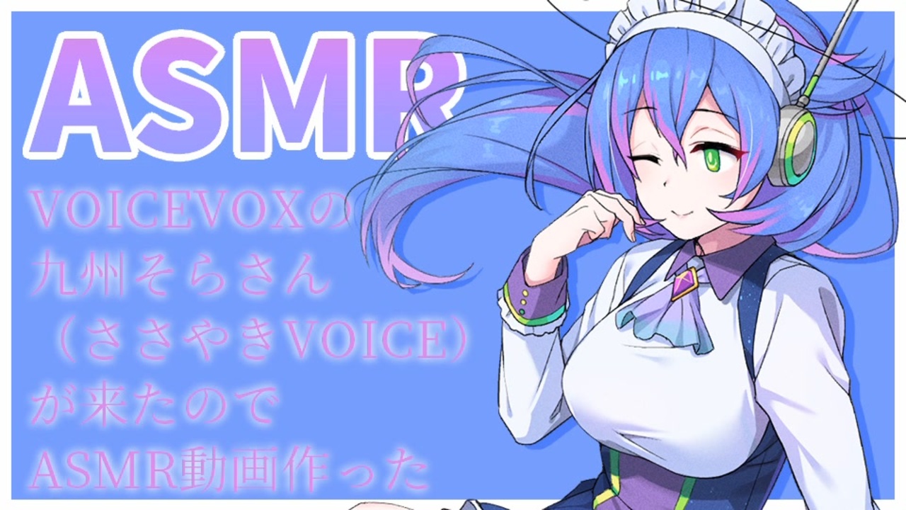 AI話声合成ソフト「VOICEVOX」に「九州そら」のささやきVoiceが来たので、ASMR動画にしました。音デカいかも。<br><br>本とは博多弁ASMRにしたかったんだけど(九州そらだから)、南の地方の方言の知見がさっぱりなかったのであきらめた。<br><br>私ASMR苦手なんで聞いたことほとんどないんですけど、たぶんこういうのですよね。<br>このジャンルのタグ付けがよく分からないので、なんかうまいことつけてもらえるとありがたいです。<br><br>【作り方】<br>1.VOICEVOXでささやき声を合成<br>2.ノイズ処理とEQ<br>3.バイノーラルパンナーで疑似バイノーラル化<br><br>絵:日々ツナさん( <a href="https://seiga.nicovideo.jp/seiga/im10913096" target="_blank" rel="noopener">im10913096</a> )