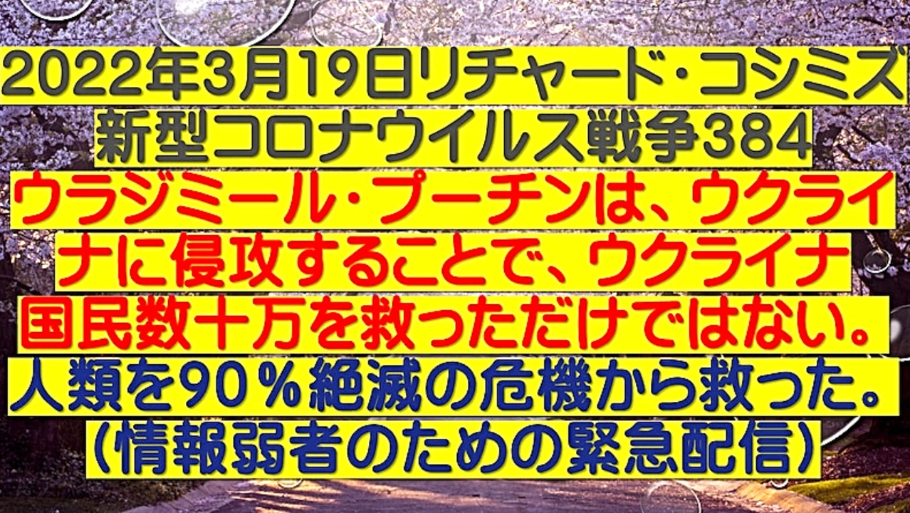 <span style="color: #cc4125;"><strong>【 テーマ:新型コロナウイルス戦争 384( 情報弱者のための緊急配信 )】</strong></span><br><br><span style="color: #ff0000;"><strong>「 ウラジミール・プーチン氏は、ウクライナに侵攻することで、ウクライナ国民数十万を<br> 救っただけではない。人類を90%絶滅の危機から救った 」<br><br> </strong></span>◆ウクライナのアザロフ元首相、「プーチンは、ウクライナ東部の数十万人の命を救った」。<br> ウクライナ政府は、2月25日からロシア系住民の皆殺しを計画していたが、ロシアはそ<br> れを防ぐために、前日に軍事介入。<br> また、NATOウクライナ基地は、ロシアへの核攻撃も計画していた。<br><br> ◆DEEP STATEハザール・マフィアは、9.11でも3.11でも核兵器を使ってきた。<br> OKCビル(オクラホマシティ連邦政府ビル爆破事件)、バリディスコ爆破事件(バ<br> リ島爆弾テロ事件)、チェルノブイリ原子力発電所事故でも。<br> よって、DEEP STATEハザールマフィアが支配するウクライナが、核兵器を使った<br> としても、何一つ不思議ではない。<br><br> ◆「アビガン・イベルメクチン」は、ビル・ゲイツらが次に投入してくる強毒ウイルス<br> (恐らく、空気感染型狂犬病)の感染予防・治療に使える特効薬である。<br><br><span style="color: #38761d;">◆</span><span style="color: #38761d;"><strong>リチャード・コシミズ 公式 ブログ</strong></span><br> <a href="https://ameblo.jp/richardneversurrender/" target="_blank" rel="noopener nofollow">https://ameblo.jp/richardneversurrender/</a><br><br><span style="color: #38761d;">◆</span><span style="color: #38761d;"><strong>リチャード・コシミズ 公式 ホームページ</strong></span><br> <a href="http://richardkoshimizu.boo.jp/" target="_blank" rel="noopener nofollow">http://richardkoshimizu.boo.jp/</a><br><br><span style="color: #38761d;">◆</span><span style="color: #38761d;"><strong>リチャード・コシミズ 講演会 公式 動画ギャラリー</strong></span><br> <a href="http://www.t-sskk.com/richardkoshimizu/video-gallery/index.html" target="_blank" rel="noopener nofollow">http://www.t-sskk.com/richardkoshimizu/video-gallery/index.html</a><br>