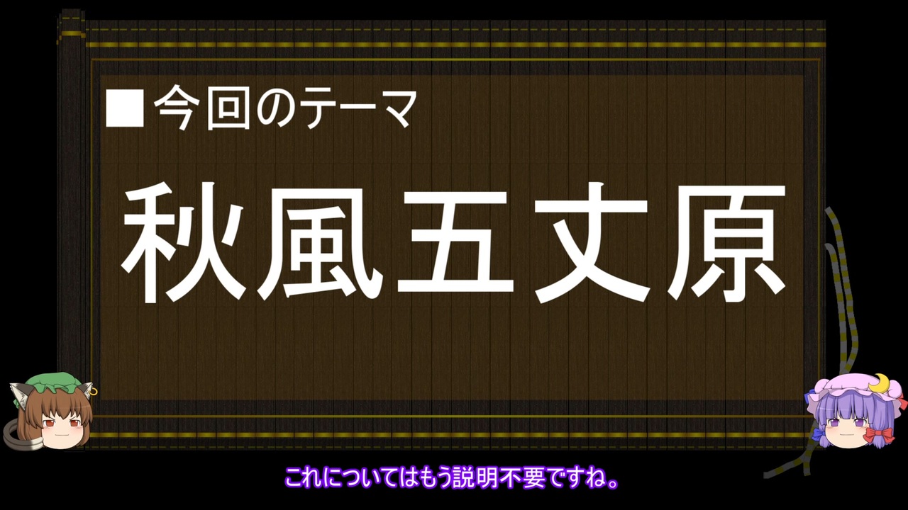 タイトルは秋風五丈原ですが、今回は司馬懿さん有能回です。<br>尚、今回は最終回ではありません。<br><br>解説 :パチュリー<br>曹叡 :橙<br>司馬懿 :永琳<br>諸葛亮 :映姫<br>満寵 :一輪<br>孫権 :レミリア<br>陸遜 :布都<br>魏延 :華扇<br>張郃 :慧音<br>郭淮 :ミスティア<br>公孫淵 :鈴仙<br>蜀軍兵士:現場猫の皆さん<br><br>■前回<br>第四次北伐後編<br><a href="https://www.nicovideo.jp/watch/sm40136227" class="watch">sm40136227</a><br><br>☆参考サイト<br>■三国志、全文検索<br><a href="http://www.seisaku.bz/sangokushi.html" target="_blank" rel="noopener nofollow">http://www.seisaku.bz/sangokushi.html</a><br><br>■三国志総合情報サイト<br><a href="https://sangokushi.jp/" target="_blank" rel="noopener nofollow">https://sangokushi.jp/</a><br><br>■维基文库(資治通鑑)<br><a href="https://zh.wikisource.org/wiki/%E8%B3%87%E6%B2%BB%E9%80%9A%E9%91%91" target="_blank" rel="noopener nofollow">https://zh.wikisource.org/wiki/%E8%B3%87%E6%B2%BB%E9%80%9A%E9%91%91</a><br><br>■BGM<br>空を見上げて /英雄伝説 空の軌跡SC オリジナルサウンドトラック / Copyright © Nihon Falcom Corporation <br><br>動画作成ツール:ゆっくりムービーメーカー3<br><a href="https://manjubox.net/ymm3/" target="_blank" rel="noopener nofollow">https://manjubox.net/ymm3/</a><br><br>立ち絵:キャラ素材(きつねゆっくり) - Nicotalk &キャラ素材配布所<br><a href="http://www.nicotalk.com/charasozai_kt.html" target="_blank" rel="noopener nofollow">http://www.nicotalk.com/charasozai_kt.html</a><br><br>AquesTalkライセンス購入済み<br>