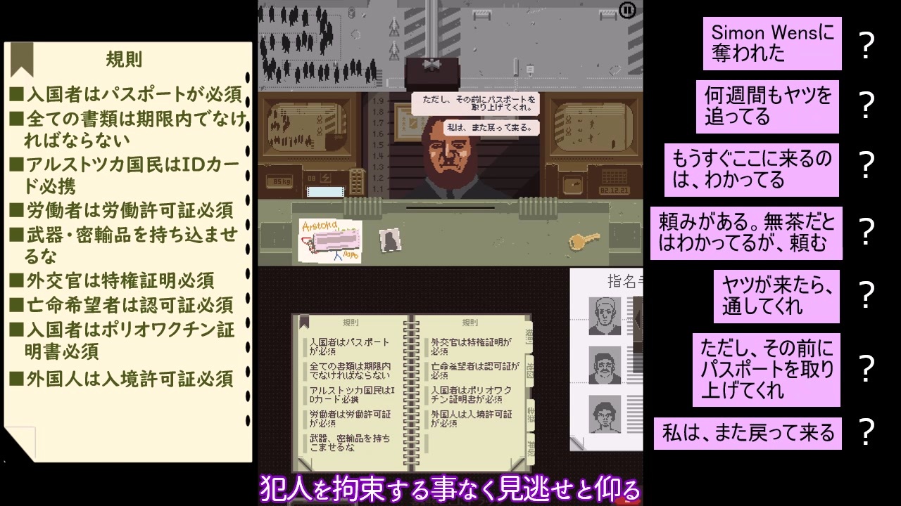 前回の動画にコメント、差し入れ、広告、いいね等ありがとうございました!<br>基本カットなしの垂れ流し動画です。<br>ゲーム内の会話の字幕は、定型文のようなセリフは字幕を省かせて頂いております。<br><br>※この動画ではコメ返等を行うおまけのお時間はありません。ご容赦ください。<br><br>*注意*<br>・ゆっくりボイスの使用<br>・ツイステのメインストーリー、パソストのネタバレの可能性あり<br>・口調、キャラ崩壊の可能性あり<br>・妄想、捏造を含む<br>・腐コメ、夢コメ、誹謗中傷コメはご遠慮ください<br>・ドット絵ですが銃、手榴弾、人が死ぬ描写等暴力的表現あり<br>・ドット絵ですが男女の下着姿あり<br>・なるべくネタバレとなるようなコメントはお控えください<br><br><br>【ゲーム】<br>『Papers,Please』iPad版<br><br>【編集】<br>・ゆっくりMovieMaker4<br><br>感想等いただけましたら嬉しいです↓<br>Twitter:@rindoct83_2525<br>マシュマロ:<a href="https://marshmallow-qa.com/rindoct83_2525?utm_medium=twitter&utm_source=promotion" target="_blank" rel="noopener nofollow">https://marshmallow-qa.com/rindoct83_2525?utm_medium=twitter&utm_source=promotion</a>