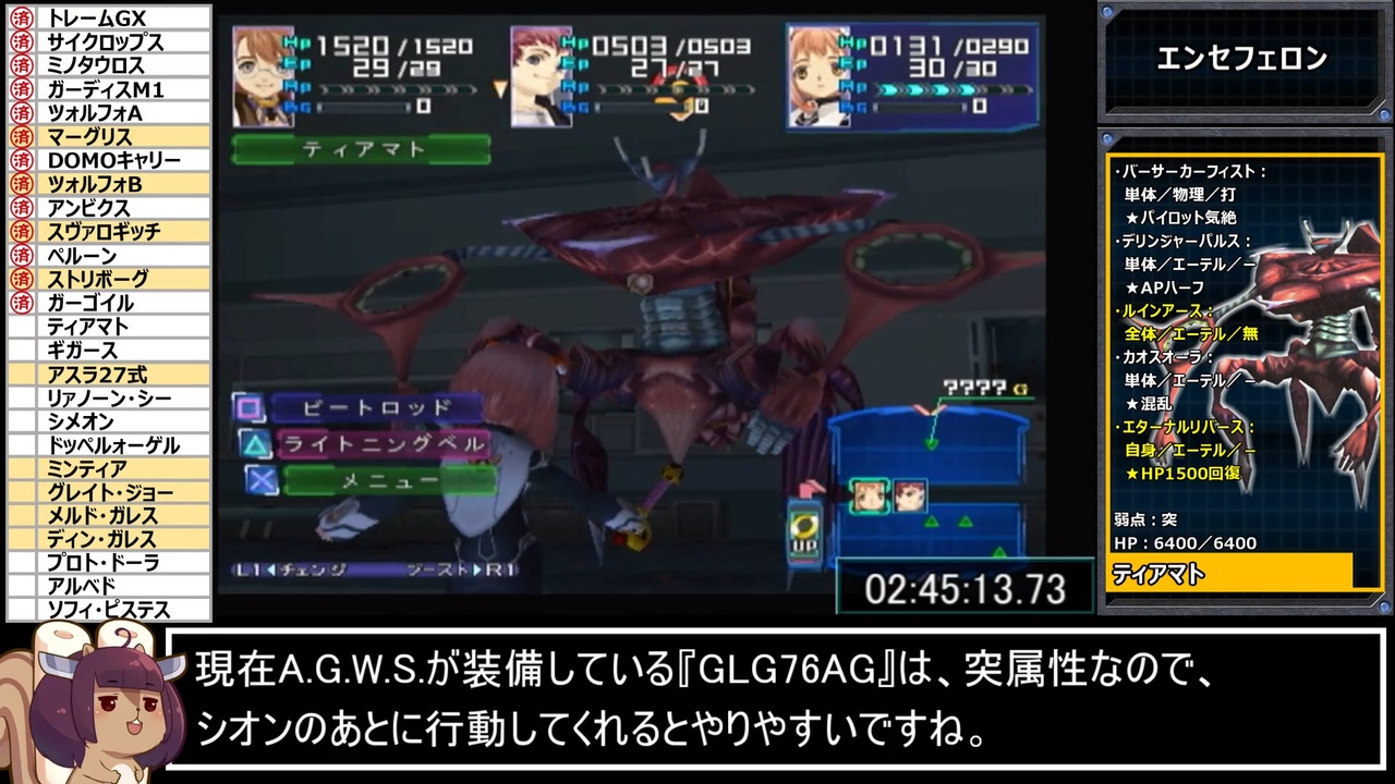 なんだよ、お前のRTAガバガバじゃねえかよ(諦め)<br><br>エンセフェロン突入~ティアマト撃破まで<br><br><a href="https://www.nicovideo.jp/watch/sm40188896" class="watch">sm40188896</a>←前|<a href="https://www.nicovideo.jp/mylist/72710842" target="_blank" rel="noopener">mylist/72710842</a>|次→<a href="https://www.nicovideo.jp/watch/sm40254271" class="watch">sm40254271</a><br><br>本パートのムービーシーンはこちら→<a href="https://www.nicovideo.jp/watch/sm40216224" class="watch">sm40216224</a>/<a href="https://www.nicovideo.jp/watch/sm40216382" class="watch">sm40216382</a><br><br>RTA part1集 <a href="https://www.nicovideo.jp/mylist/71936684" target="_blank" rel="noopener">mylist/71936684</a><br><br><strong><u>▼お借りした素材達</u></strong><br>・【blueberry様】:東北リスたん素材 - <a href="https://seiga.nicovideo.jp/seiga/im6398652" target="_blank" rel="noopener">im6398652</a><br>・【インギンブレイ様】:解説枠(SF) - <a href="https://commons.nicovideo.jp/works/nc25831" target="_blank" rel="noopener">nc25831</a><br>・【まゆたまP様】:【720HD】びりびり電撃 - <a href="https://commons.nicovideo.jp/works/nc49457" target="_blank" rel="noopener">nc49457</a><br><br><strong><u>▼プレイ環境</u></strong><br>・本体(実機):SCPH-70000<br>・コントローラ:SCPH-10010<br>・ディスク:普通のやつ<br><br><strong><u>▼レギュレーション/縛り等</u></strong><br>・計測開始:PS2起動時<br>・計測終了:ラスボス(ソフィ・ピステス)の撃破ムービーが開始した瞬間<br>・バグ禁止<br>・任意戦闘を含む、全ての中ボス・隠しボスを倒してクリアする