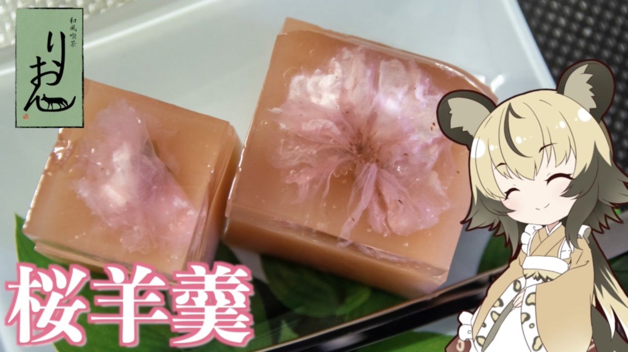 手作り和菓子16回目は「桜羊羹」です。<br>塩漬けの桜を使って<br>錦玉寒と羊羹を組み合わせた<br>お花見を楽しめるオリジナル羊羹を作ってみました。<br><br><br>■材料<br>桜の錦玉寒<br>・塩漬けの桜 お好みの数<br>・水 100mL<br>・砂糖 100g<br>・寒天パウダー 2g<br><br>羊羹<br>・水 100g<br>・寒天パウダー 2g<br>・白あん 200g<br>・食紅 適量<br><br><br>去年の桜だと思いますが、春の食材?ということで<br>超料理動画投稿祭2022に投稿しますよ<br><br>youtube:<a href="https://youtu.be/ZFgIWIPN-ew" target="_blank" rel="noopener nofollow">https://youtu.be/ZFgIWIPN-ew</a><br />twitter:@lycaon_kitchen<br><br>りおんの和風喫茶:<a href="https://www.nicovideo.jp/series/77190" target="_blank" rel="noopener">series/77190</a><br>おつかれごはん:<a href="https://www.nicovideo.jp/series/155690" target="_blank" rel="noopener">series/155690</a><br>手作り和菓子でちょっとひとやすみしませんか?:<a href="https://www.nicovideo.jp/series/155691" target="_blank" rel="noopener">series/155691</a><br><br><span style="color: rgba(0, 0, 0, 0.87);">立ち絵:</span>星華 彩二魔 様<br><span style="color: rgba(0, 0, 0, 0.87);">イラスト:いらすとや、AWD kitchen<br>音源:DOVA-SYNDROME、ポケットサウンド<br>音声:VOICEROID2 </span>紲星あかり、東北イタコ + exVOICE