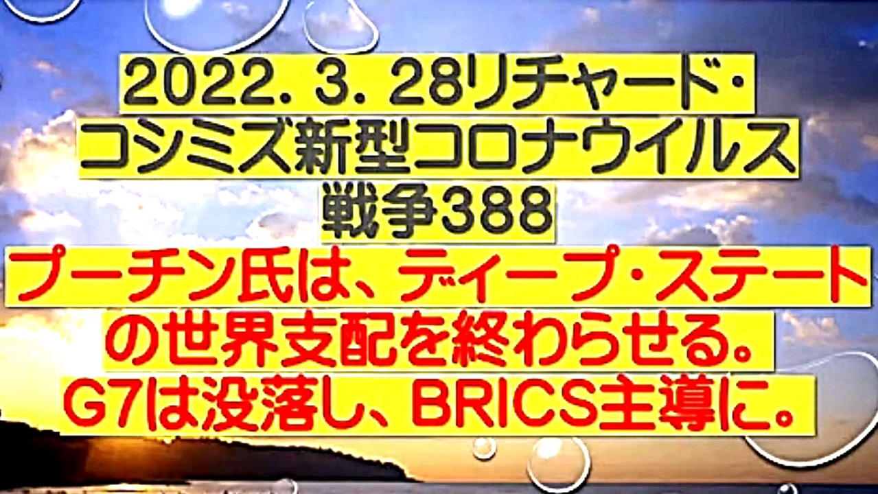 <span style="color: #cc4125;"><strong>【 テーマ:新型コロナウイルス戦争 388 】</strong></span><br><br><span style="color: #ff0000;"><strong>「 ウラジーミル・プーチン氏は、ディープ・ステートの世界支配を終わらせる。<br> G7は没落し、BRICS(Brazil,Russia,India,China,South Africa)主導に 」</strong></span><br><br> ◆対露制裁は、米 + EU + 金魚の糞だけ。<br><br> ◆ジョー・バイデンは、国際社会の代表者のつもりらしいが、米国はもはや、世界の覇者ではない。<br> よって、G7は、先進7か国ではない。G7とは、ディープステート支配下の国家のことである。<br> 日本も奴隷国家なので、G7に所属している。世界のリーダーではない。<br> <br><br> ◆対露制裁に実効力なし。逆に、制裁する側が困る。ガソリン高騰でバイデン支持率↓<br> (共和党支持者は反駁)。<br> ウクライナ危機を契機に、BRICS主導の世界に。<br><br><span style="color: #38761d;">◆</span><span style="color: #38761d;"><strong>リチャード・コシミズ 公式 ブログ</strong></span><br> <a href="https://ameblo.jp/richardneversurrender/" target="_blank" rel="noopener nofollow">https://ameblo.jp/richardneversurrender/</a><br><br><span style="color: #38761d;">◆</span><span style="color: #38761d;"><strong>リチャード・コシミズ 公式 ホームページ</strong></span><br> <a href="http://richardkoshimizu.boo.jp/" target="_blank" rel="noopener nofollow">http://richardkoshimizu.boo.jp/</a><br><br><span style="color: #38761d;">◆</span><span style="color: #38761d;"><strong>リチャード・コシミズ 講演会 公式 動画ギャラリー</strong></span><br> <a href="http://www.t-sskk.com/richardkoshimizu/video-gallery/index.html" target="_blank" rel="noopener nofollow">http://www.t-sskk.com/richardkoshimizu/video-gallery/index.html</a><br>