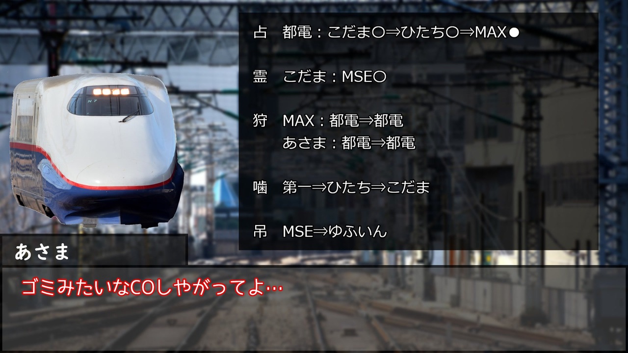 CO合戦はアツいので僕は好きです。<br><br>12B:村5/占1/霊1/狩1/狼2/狂1/狐1<br><br>2日目:<a href="https://www.nicovideo.jp/watch/sm40241845" class="watch">sm40241845</a><br>3日目⇒<a href="https://www.nicovideo.jp/watch/sm40244353" class="watch">sm40244353</a> 5日目⇒<a href="https://www.nicovideo.jp/watch/sm40253233" class="watch">sm40253233</a><br><br>2025/03/18 1:15<br>ニコニコ動画の上書き修正開放キャンペーンに伴い、リニューアル版への差し替えを行いました。<br>それにより、一部コメント箇所がずれている場所があるかも知れません。<br>ご了承ください。<br><br>Twitterで考察して頂ける方は#電車で人狼 を入れて呟いていただけると探しやすいです。<br><br>電車で人狼!マイリスト <a href="https://www.nicovideo.jp/mylist/72946958" target="_blank" rel="noopener">mylist/72946958</a><br>電車で人狼! 支線編(解説動画) <a href="https://www.nicovideo.jp/mylist/79077747" target="_blank" rel="noopener">mylist/79077747</a><br>人狼動物園マイリスト <a href="https://www.nicovideo.jp/mylist/72986089" target="_blank" rel="noopener">mylist/72986089</a><br><br><a target="_blank" href="https://qa.nicovideo.jp/faq/show/19424?site_domain=default" style="font-size: 13px;color: #657586; text-decoration: underline; line-height: 1.4">この動画は投稿者によって修正されました</a>