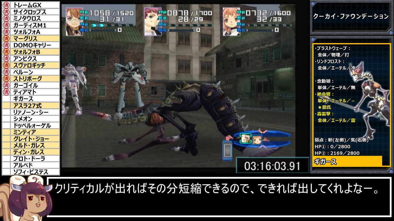 豪運をガバで帳消ししていくスタイル<br><br>KF襲撃~ギガース撃破まで<br><br><a href="https://www.nicovideo.jp/watch/sm40216032" class="watch">sm40216032</a>←前|<a href="https://www.nicovideo.jp/mylist/72710842" target="_blank" rel="noopener">mylist/72710842</a>|次→<a href="https://www.nicovideo.jp/watch/sm40281555" class="watch">sm40281555</a><br><br>本パートのムービーシーンはこちら→<a href="https://www.nicovideo.jp/watch/sm40254574" class="watch">sm40254574</a><br>※リンクが前のままだったので修正しました。ご指摘ありがとナス!<br><br>RTA part1集 <a href="https://www.nicovideo.jp/mylist/71936684" target="_blank" rel="noopener">mylist/71936684</a><br><br><strong><u>▼お借りした素材達</u></strong><br>・【blueberry様】:東北リスたん素材 - <a href="https://seiga.nicovideo.jp/seiga/im6398652" target="_blank" rel="noopener">im6398652</a><br>・【インギンブレイ様】:解説枠(SF) - <a href="https://commons.nicovideo.jp/works/nc25831" target="_blank" rel="noopener">nc25831</a><br><br><strong><u>▼プレイ環境</u></strong><br>・本体(実機):SCPH-70000<br>・コントローラ:SCPH-10010<br>・ディスク:普通のやつ<br><br><strong><u>▼レギュレーション/縛り等</u></strong><br>・計測開始:PS2起動時<br>・計測終了:ラスボス(ソフィ・ピステス)の撃破ムービーが開始した瞬間<br>・バグ禁止<br>・任意戦闘を含む、全ての中ボス・隠しボスを倒してクリアする