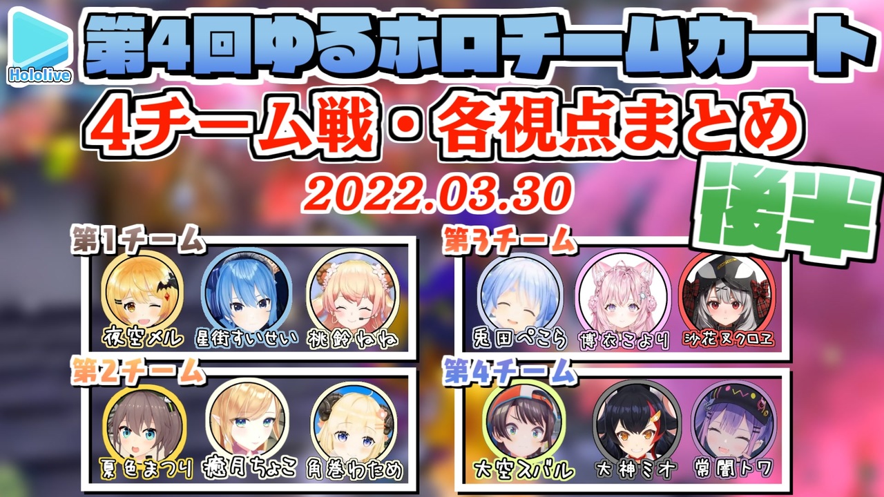 <a href="#" class="seekTime" data-seekTime="00:00" onclick="seekNicoPlayer('#00:00'); return false;">#00:00</a> レース前<br><a href="#" class="seekTime" data-seekTime="01:30" onclick="seekNicoPlayer('#01:30'); return false;">#01:30</a> 第1レース パリプロムナード<br><a href="#" class="seekTime" data-seekTime="05:29" onclick="seekNicoPlayer('#05:29'); return false;">#05:29</a> 第2レース キノコリッジウェイ<br><a href="#" class="seekTime" data-seekTime="10:03" onclick="seekNicoPlayer('#10:03'); return false;">#10:03</a> 第3レース トーキョースクランブル<br><a href="#" class="seekTime" data-seekTime="14:31" onclick="seekNicoPlayer('#14:31'); return false;">#14:31</a> 第4レース ニンニンドージョー<br><br>メル <a href="https://youtu.be/9ZiuKqVLdVc" target="_blank" rel="noopener nofollow">https://youtu.be/9ZiuKqVLdVc</a><br>まつり <a href="https://youtu.be/AWbNiQ-Xn9E" target="_blank" rel="noopener nofollow">https://youtu.be/AWbNiQ-Xn9E</a><br>ちょこ <a href="https://youtu.be/dtLUYHxSkBY" target="_blank" rel="noopener nofollow">https://youtu.be/dtLUYHxSkBY</a><br>スバル <a href="https://youtu.be/DyqYSXDzblA" target="_blank" rel="noopener nofollow">https://youtu.be/DyqYSXDzblA</a><br>ミオ <a href="https://youtu.be/ZI-qpxcfNHA" target="_blank" rel="noopener nofollow">https://youtu.be/ZI-qpxcfNHA</a><br>すいせい <a href="https://youtu.be/0v_Yba3r3mQ" target="_blank" rel="noopener nofollow">https://youtu.be/0v_Yba3r3mQ</a><br>ぺこら <a href="https://youtu.be/D0edycIaHOA" target="_blank" rel="noopener nofollow">https://youtu.be/D0edycIaHOA</a><br>わため <a href="https://youtu.be/ocX7ERPSmXI" target="_blank" rel="noopener nofollow">https://youtu.be/ocX7ERPSmXI</a><br>トワ <a href="https://youtu.be/LyQcoGQR3G8" target="_blank" rel="noopener nofollow">https://youtu.be/LyQcoGQR3G8</a><br>ねね <a href="https://youtu.be/Gv7EgYzIPyo" target="_blank" rel="noopener nofollow">https://youtu.be/Gv7EgYzIPyo</a><br>こより <a href="https://youtu.be/s3stvoFRVC0" target="_blank" rel="noopener nofollow">https://youtu.be/s3stvoFRVC0</a><br>クロヱ <a href="https://youtu.be/hQOsT4EFwYI" target="_blank" rel="noopener nofollow">https://youtu.be/hQOsT4EFwYI</a><br /><span style="color: #b7b7b7; font-size: 10px;">ホロライブ切り抜き/なめたけ <a href="https://t.co/CBwJLnYR2c" target="_blank" rel="noopener nofollow">https://t.co/CBwJLnYR2c</a></span>