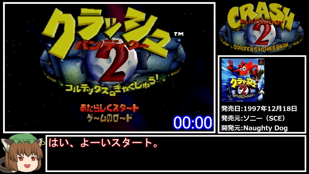 6年越しの再走です。<br><br><br><br>タイマースタート:クラッシュを制御できるようになった瞬間(コルテックスとの会話時)<br>タイマーストップ:コルテックス撃破時<br>使用機種:PS2 SCPH-90000SS(高速読み込みあり)<br><br><br>クラッシュ1RTA:<a href="https://www.nicovideo.jp/watch/sm39982107" class="watch">sm39982107</a><br>クラッシュ2RTA(バグなし):<a href="https://www.nicovideo.jp/watch/sm28559864" class="watch">sm28559864</a><br>クラッシュ3RTA(バグなし):<a href="https://www.nicovideo.jp/watch/sm28135203" class="watch">sm28135203</a><br>クラッシュ3RTA(バグあり):<a href="https://www.nicovideo.jp/watch/sm40402052" class="watch">sm40402052</a><br>参考動画1(力石バグ解説動画)<a href="https://www.nicovideo.jp/watch/sm11343110" class="watch">sm11343110</a><br>参考動画2(ピロ彦兄貴のTAS動画):<a href="https://www.nicovideo.jp/watch/sm10240804" class="watch">sm10240804</a><br>RTAまとめ:<a href="https://www.nicovideo.jp/mylist/56827667" target="_blank" rel="noopener">mylist/56827667</a><br>更新報告:<a href="https://twitter.com/yamabukiginu" target="_blank" rel="noopener nofollow">https://twitter.com/yamabukiginu</a>
