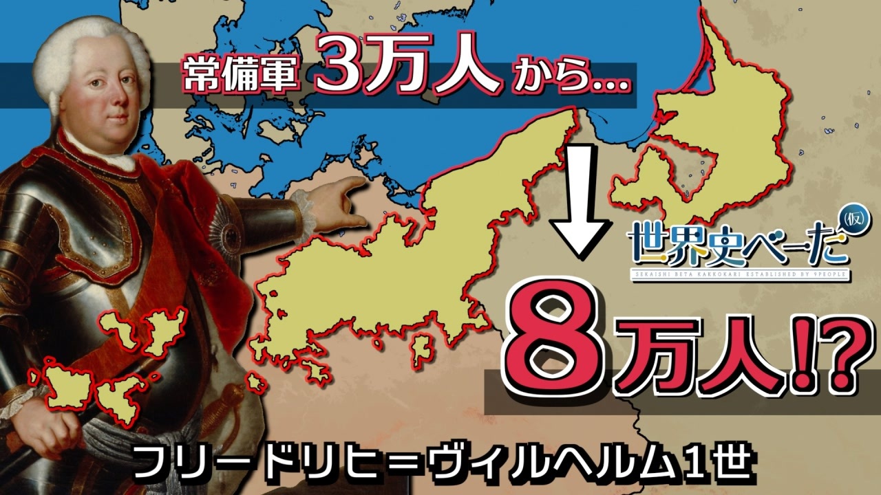 プロイセン王国はドイツ統一を主導した国ですが、1701年時点ではそこまでの力を持っていませんでした。フリードリヒ=ヴィルヘルム1世は、内政改革と軍備強化によって、未来の戦争を勝ち抜くための基礎的な体力と武力を身につけたと言えるでしょう。<br><br>解説マイリスト:<a href="https://www.nicovideo.jp/mylist/64165927" target="_blank" rel="noopener">mylist/64165927</a><br>hoi4関連マイリスト:<a href="https://www.nicovideo.jp/mylist/64165916" target="_blank" rel="noopener">mylist/64165916</a><br><br><br>内容に間違い等あればTwitterまで<br><a href="https://twitter.com/kunai_sn" target="_blank" rel="noopener nofollow">https://twitter.com/kunai_sn</a><br><br><br>「世界史べーた(仮)」<br><a href="https://www.youtube.com/c/sekaishibeta" target="_blank" rel="noopener nofollow">https://www.youtube.com/c/sekaishibeta</a><br><br>参加者<br>・いのっち @inocchi_0515 <a href="https://www.nicovideo.jp/user/56922519" target="_blank" rel="noopener">user/56922519</a><br>・海鳥 @UmidoriAdmiral<br>・カレル @zattukur <a href="https://www.nicovideo.jp/user/43313493" target="_blank" rel="noopener">user/43313493</a><br>・くない_S.N. @kunai_sn <a href="https://www.nicovideo.jp/user/33977281" target="_blank" rel="noopener">user/33977281</a><br>・※(米印) @kome_asterisk <a href="https://www.nicovideo.jp/user/66961733" target="_blank" rel="noopener">user/66961733</a><br>・ZEKE22 @zeke_22 <a href="https://www.nicovideo.jp/user/55635915" target="_blank" rel="noopener">user/55635915</a><br>・スティーヴ @Steve_foxes <a href="https://www.nicovideo.jp/user/120931891" target="_blank" rel="noopener">user/120931891</a><br>・せるヴぁんだ @PS_Servanda <a href="https://www.nicovideo.jp/user/89884381" target="_blank" rel="noopener">user/89884381</a><br>・チレキスキー @chireki25LCs <a href="https://www.nicovideo.jp/user/86309220" target="_blank" rel="noopener">user/86309220</a><br>・Fieseler @Baden_1918 <a href="https://www.nicovideo.jp/user/79295171" target="_blank" rel="noopener">user/79295171</a><br>・眞白 @yu_mashiro3<br>・メスキィタ @xayjjo <a href="https://www.nicovideo.jp/user/19512004" target="_blank" rel="noopener">user/19512004</a><br>・ゆはる @Yuharumuri <a href="https://www.nicovideo.jp/user/23721097" target="_blank" rel="noopener">user/23721097</a><br><br>