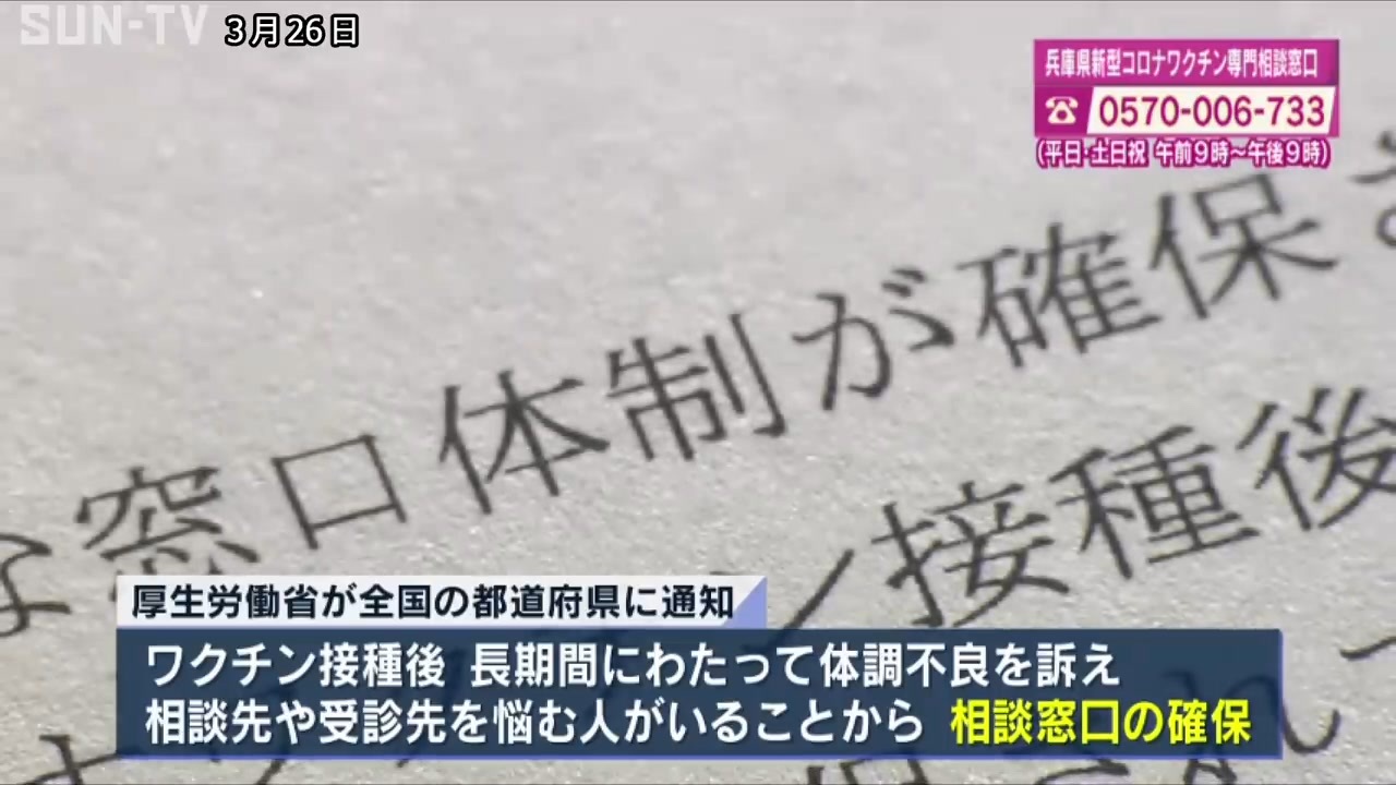 新型コロナワクチン接種後の長期間の体調不良 厚労省が全国の都道府県に患者サポートをワクチン後遺症健康被害相談窓口(サンテレビニュースで放映だって)<br>菅元総理、岸田現総理、河野太郎がコロナワクチンの弊害を国民に知らせず強権推奨に近いことをやった 。河野太郎に至っては2億人米国でワクチン打って一人も死んでいない!と大噓ついた。<br>同調圧力も企業にかけて職員を圧迫した。今もそれは続いている。<br>誤魔化して国民にわくちん打たせていたが、もうワクチン健康被害が隠蔽できなくなって来ている。