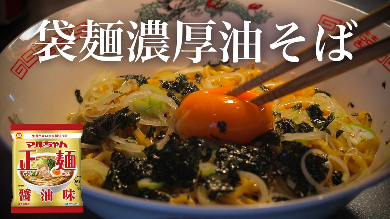 【レシピ】<br><br>〜材料〜<br>・まるちゃん製麺 醤油味 1袋<br>・ネギ 適量<br>・ごま 適量<br>・海苔 1枚<br>・卵黄 1個 ※卵白はスープに使ってね<br>◆醤油 小さじ1/2<br>◆ニンニクチューブ 1~2cm<br>◆ごま油 小さじ1/2<br>◆ブラックペッパー お好み<br>◆スープの素 半分 ※あまりはスープに使ってね<br><br>①袋麺を2分30秒茹でる間に、(◆)の調味料を混ぜ合わせて、油そばのタレを作る。<br><br>②麺が茹であがったらタレと混ぜ合わせて、お好みのトッピングをして完成!マヨネーズとかお酢をぶっかけても美味しいと思います!!<br><br>使用機材やキッチン用品はこちら♪<br><br>【まな板】<br><a href="https://a.r10.to/hw7tXm" target="_blank" rel="noopener nofollow">https://a.r10.to/hw7tXm</a><br><br>【グローバル包丁】<br>⇨<a href="https://a.r10.to/hU42cU" target="_blank" rel="noopener nofollow">https://a.r10.to/hU42cU</a><br><br>【和包丁】<br>⇨<a href="https://a.r10.to/hwtib2" target="_blank" rel="noopener nofollow">https://a.r10.to/hwtib2</a><br><br>【フライパン】<br>⇨<a href="https://a.r10.to/hPPKUa" target="_blank" rel="noopener nofollow">https://a.r10.to/hPPKUa</a><br><br>【使用カメラ】<br>キヤノン|CANON EOS Kiss X10i ダブルズームキット <br>デジタル一眼レフカメラ ブラック EOSKISSX10IWKIT <br>⇨<a href="https://a.r10.to/haXtfx" target="_blank" rel="noopener nofollow">https://a.r10.to/haXtfx</a><br><br>【使用レンズ】<br><br><br>おつまみ研究所について<br>「仕事終わりでクタクタ…」「今日の晩飯どうしよう…」そういった悩みを持った30代の男性に向けた、手抜きでめちゃくちゃ旨いおつまみレシピを配信しています!<br>現役Webマーケター兼YouTuberなので、お仕事の相談などはメールか、下記のSNSのDMよりお願いします!<br><br>【Instagram】↓レシピ、プライベートを配信中↓<br><br><a href="https://www.instagram.com/akataro77cooking/?hl=ja" target="_blank" rel="noopener nofollow">https://www.instagram.com/akataro77cooking/?hl=ja</a><br />いつもコメント、広告本当にありがとうございます!<br>【Twitterに遊びにきてね】<br>@akatro77<br><br>【Instagram】<br>akataro77cooking