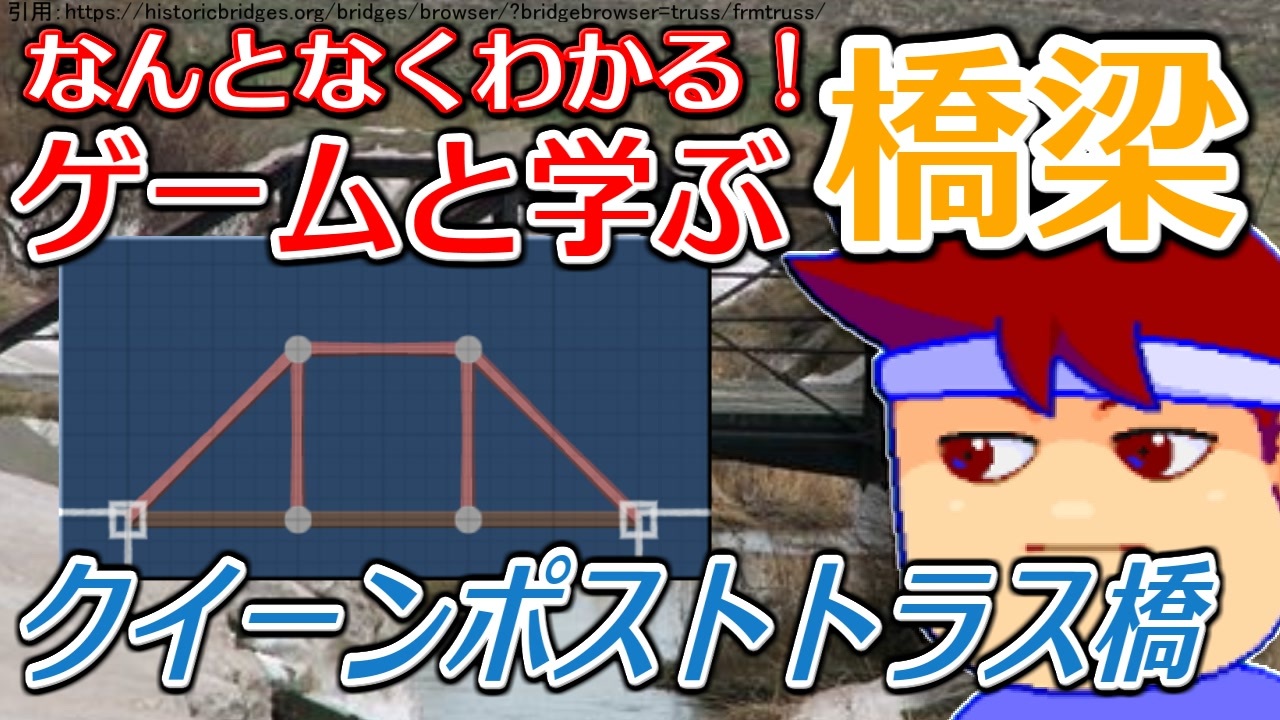 【あわせて見たい】<br>キングポストトラス橋について<br><a href="https://www.youtube.com/watch?v=_TANDpvA6fI&feature=youtu.be" target="_blank" rel="noopener nofollow">https://www.youtube.com/watch?v=_TANDpvA6fI&feature=youtu.be</a><br><br>【参考文献】<br>Wikipedia「トラス橋」<br><a href="https://ja.wikipedia.org/wiki/トラス橋" target="_blank" rel="noopener nofollow">https://ja.wikipedia.org/wiki/トラス橋</a><br><br>(株) 匠 総合事務所「クィーンポストトラス」<br><a href="http://www.kenchikuyogo.com/113-ku/043-queen.htm" target="_blank" rel="noopener nofollow">http://www.kenchikuyogo.com/113-ku/043-queen.htm</a><br><br>(株) 匠 総合事務所「対束」<br><a href="http://www.kenchikuyogo.com/313-tsu/031-tsuiduka.htm" target="_blank" rel="noopener nofollow">http://www.kenchikuyogo.com/313-tsu/031-tsuiduka.htm</a><br><br>村田研究室オンラインテキスト「トラス構造(1)」<br><a href="http://wwwra.meijo-u.ac.jp/labs/ra007/murata/onlinetext/outline/step3_1.html" target="_blank" rel="noopener nofollow">http://wwwra.meijo-u.ac.jp/labs/ra007/murata/onlinetext/outline/step3_1.html</a><br><br>Bridge Browser「Erb Farm Bridge」<br><a href="https://historicbridges.org/bridges/browser/?bridgebrowser=truss/frmtruss/" target="_blank" rel="noopener nofollow">https://historicbridges.org/bridges/browser/?bridgebrowser=truss/frmtruss/</a><br><br /><br>◆◇◆◇<br>バーチャルいいゲーマー : <a href="https://www.nicovideo.jp/series/169043" target="_blank" rel="noopener">series/169043</a><br>バーチャルいいゲーマー2: <a href="https://www.nicovideo.jp/series/354647" target="_blank" rel="noopener">series/354647</a><br>バーチャルいいゲーマー3: <a href="https://www.nicovideo.jp/series/456136" target="_blank" rel="noopener">series/456136</a><br>バーチャルいいゲーマー4: <a href="https://www.nicovideo.jp/series/519895" target="_blank" rel="noopener">series/519895</a><br>バーチャルいいゲーマー5: <a href="https://www.nicovideo.jp/series/535323" target="_blank" rel="noopener">series/535323</a><br><br>いい道 : <a href="https://www.nicovideo.jp/series/34469" target="_blank" rel="noopener">series/34469</a><br>RTA動画パート1集 : <a href="https://www.nicovideo.jp/mylist/53648285" target="_blank" rel="noopener">mylist/53648285</a><br>◆◇◆◇<br><br><span style="color: #ff0000; font-size: 16px;"><strong>生放送(毎日19:10~)<br>今シーズンは……「ダンガンロンパ」ほかをプレイ中……。</strong></span><br><span style="color: #ff0000; font-size: 18px;"><strong>⇒ <a href="https://www.twitch.tv/usui_iigame" target="_blank" rel="noopener nofollow">https://www.twitch.tv/usui_iigame</a></strong></span><br><br><strong>★FanBox ⇒ <a href="https://usui-iigame.fanbox.cc/" target="_blank" rel="noopener nofollow">https://usui-iigame.fanbox.cc/</a></strong><br><br><span style="font-size: 10px;">Twitter(フォローしてね) ⇒ <a href="https://twitter.com/usui_iigame" target="_blank" rel="noopener nofollow">https://twitter.com/usui_iigame</a><br>Youtube(毎日19:00~世界最速プレミア配信)⇒ <a href="https://www.youtube.com/channel/UCyEph50XfHDSig0umxV4_lQ" target="_blank" rel="noopener nofollow">https://www.youtube.com/channel/UCyEph50XfHDSig0umxV4_lQ</a><br>攻略Wiki(非公式) ⇒ <a href="https://seesaawiki.jp/virtual-ii-gamer/" target="_blank" rel="noopener nofollow">https://seesaawiki.jp/virtual-ii-gamer/</a></span>
